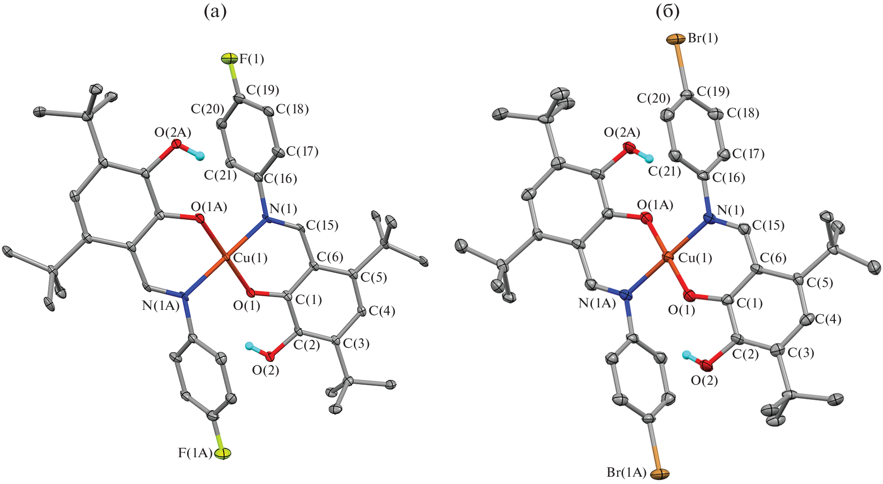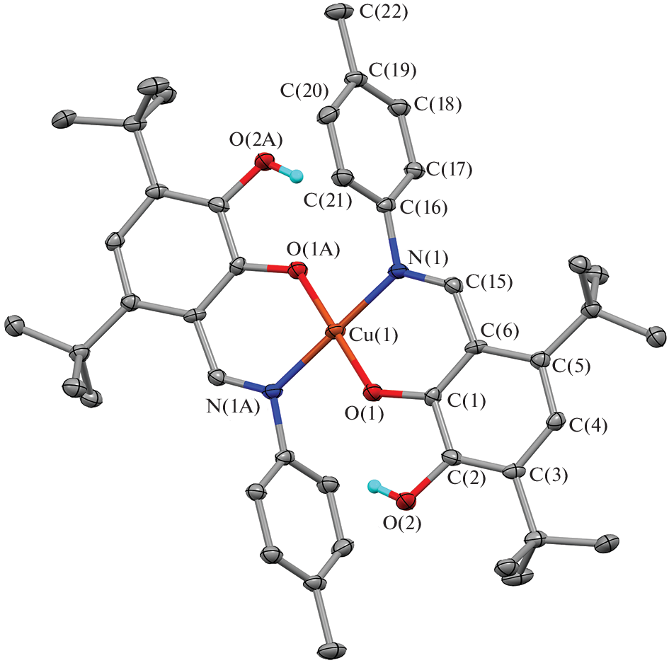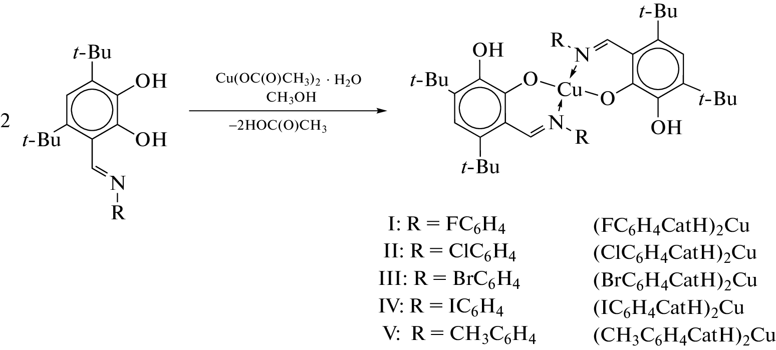 The exchange reactions of 4,6-di-tert-butylpyrocatechols containing in position 3 different N‑aryliminomethyl groups (aryl is p-halophenyl; halogen is fluorine (I), chlorine (II), bromine (III), and iodine (IV); p-tolyl (V)) with copper(II) acetate in a molar ratio of 2 : 1 afford planar square copper(II) o‑iminophenolate complexes of the general formula [(R-CatH)2Cu], where R is the aryl substituent in the Ar–N=CH group. The molecular structures of complexes I, III, and V in the crystalline state are determined by X-ray diffraction (XRD) (CIF files CCDC nos. 2227448 (I), 2226727 (III), and 2227449 (V)). The electrochemical properties of compounds I–V are studied by cyclic voltammetry.