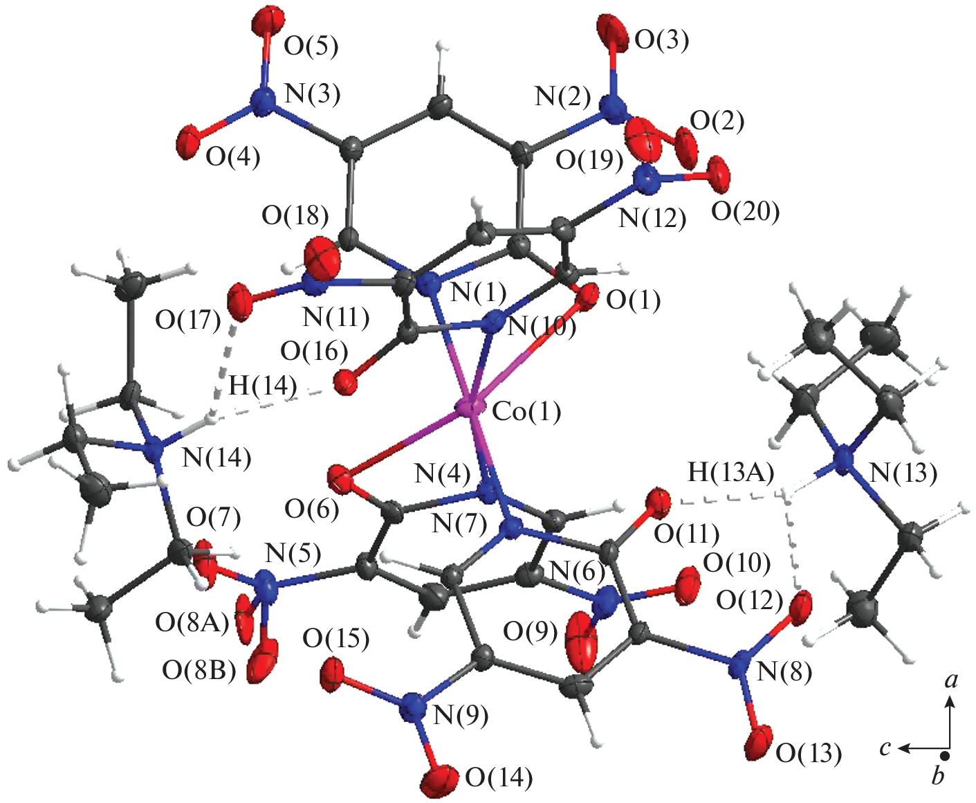 The ionic compound [Co(OC5H2N(NO2)2)4]((C2H5)3NH)2 (I) was synthesized by the reaction of CoCl2·6H2O with 2-hydroxy-3,5-dinitropyridine in acetonitrile in the presence of triethylamine as a deprotonating agent. The structure of compound I was studied by X-ray diffraction (CCDC no. 2196071) and thermodynamic characteristics of I were determined.