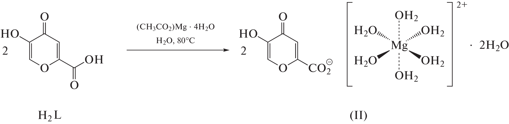 The coordination compound [Mg(HCom)2(H2O)6]·2H2O (I) was obtained by the reaction of comenic acid (H2Com) with magnesium acetate in water. The formation of a new phase was confirmed by powder X-ray diffraction. The molecular formula of the compound was determined from energy dispersive X-ray fluorescence and thermogravimetry data. The thermo-oxidative stability of magnesium comenate was studied by simultaneous thermal analysis in air. The molecular structure of the complex was discussed on the basis of spectral data (NMR, IR, and UV spectroscopy) and studied in detail using X-ray diffraction (CCDC no. 2 207 835). Magnesium comenate crystallizes in the triclinic system, space group P1¯,