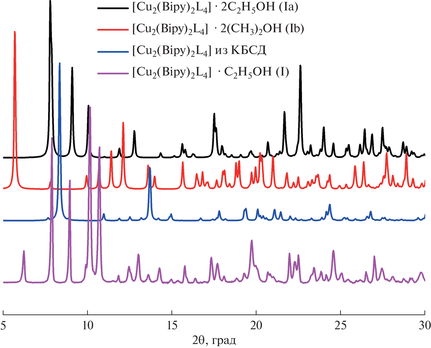 Five coordination compounds [Cu2(Bipy)2L4]·C2H5OH (Iа, Ib), [Cu2(Dmbipy)2L4] (II),