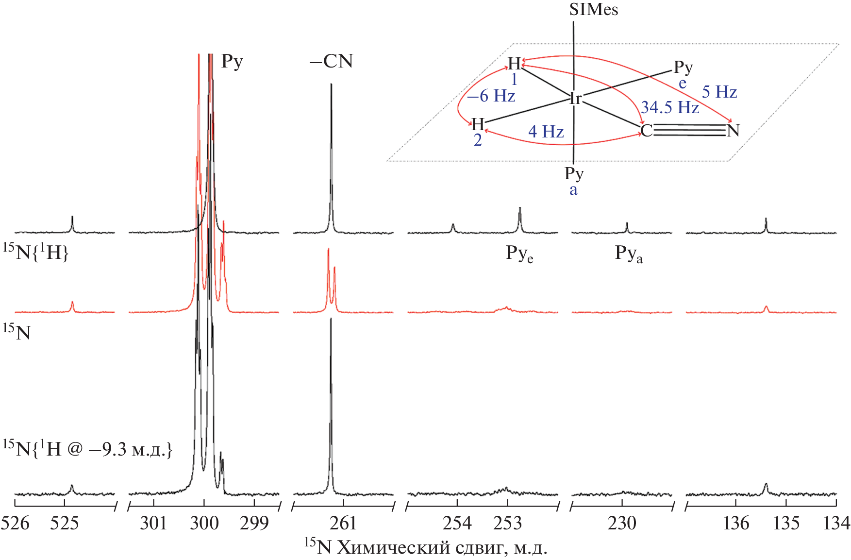 На примере нового карбенового комплекса иридия впервые продемонстрирована возможность создания высокой степени спиновой поляризации ядер 13C и 15N в цианид-анионе, образующем координационную связь с ионом металла, под действием параводорода. В ходе анализа спектров ЯМР 13С, зарегистрированных с использованием широкополосной и селективной гетероядерной развязки, определены константы спин-спинового взаимодействия в полученном комплексе и установлено строение гидридного интермедиата. Показано, что цианид-анион координируется к иону металла атомом углерода в одном из двух экваториальных положений, а две молекулы пиридина располагаются в аксиальном и экваториальном положениях. Коэффициент усиления сигналов ядер 13С и 15N цианид-аниона (5665 и –49 555 соответственно) оценен при помощи спектроскопии ЯМР поляризованного вещества методом SABRE из ультраслабого магнитного поля 0.5 мкТл. Данное усиление соответствует 15.5% поляризации ядер азота, достигнутой за несколько секунд при комнатной температуре.