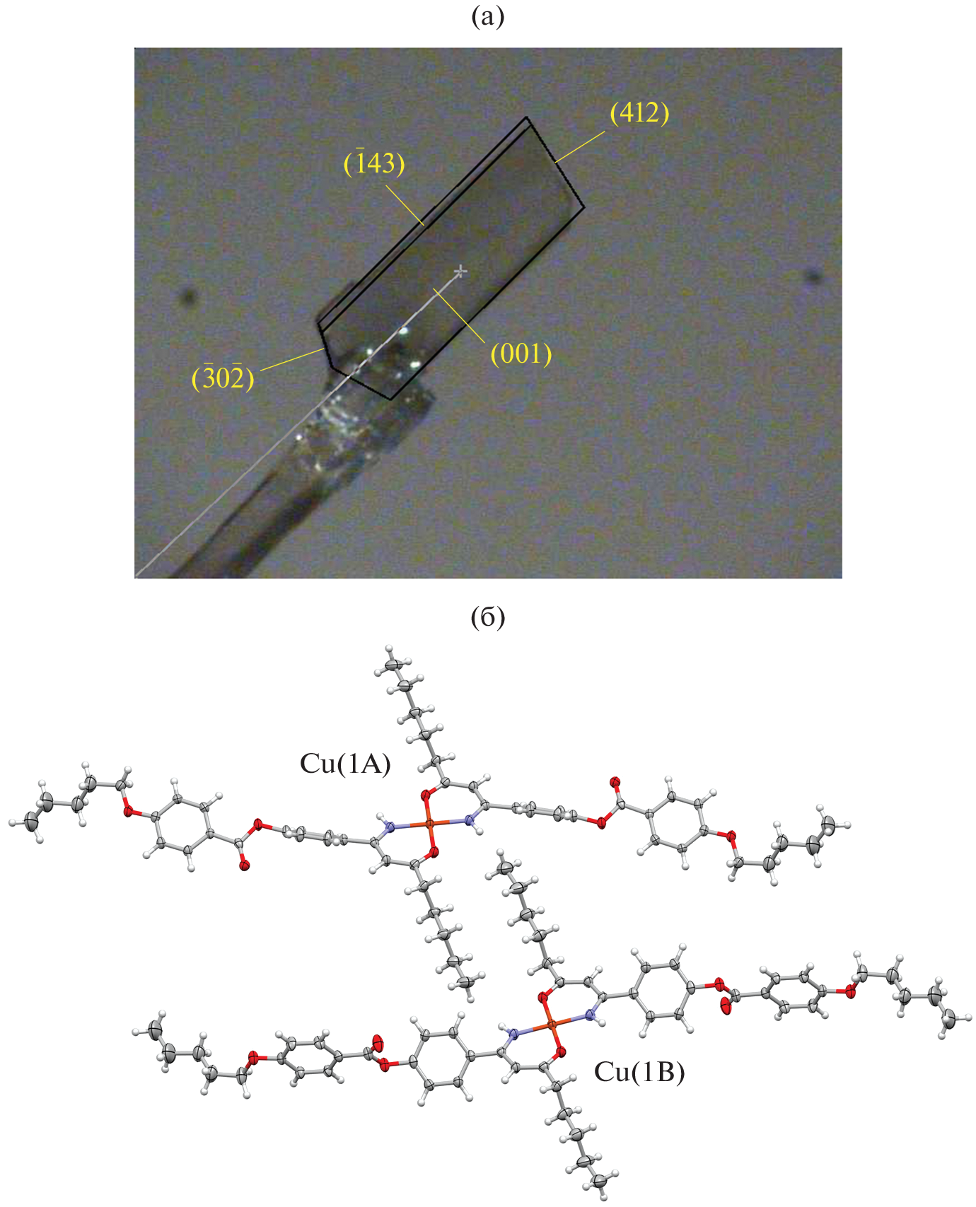 The structure and magnetic properties of the single crystal of bis{1-[4-(4-pentyloxybenzoyl-oxy)phenyl]-1-amino-3-pentylprop-1-en-3-onate}copper(II), which shows nematic mesomorphism, were studied by X-ray diffraction and electron spin resonance spectroscopy.