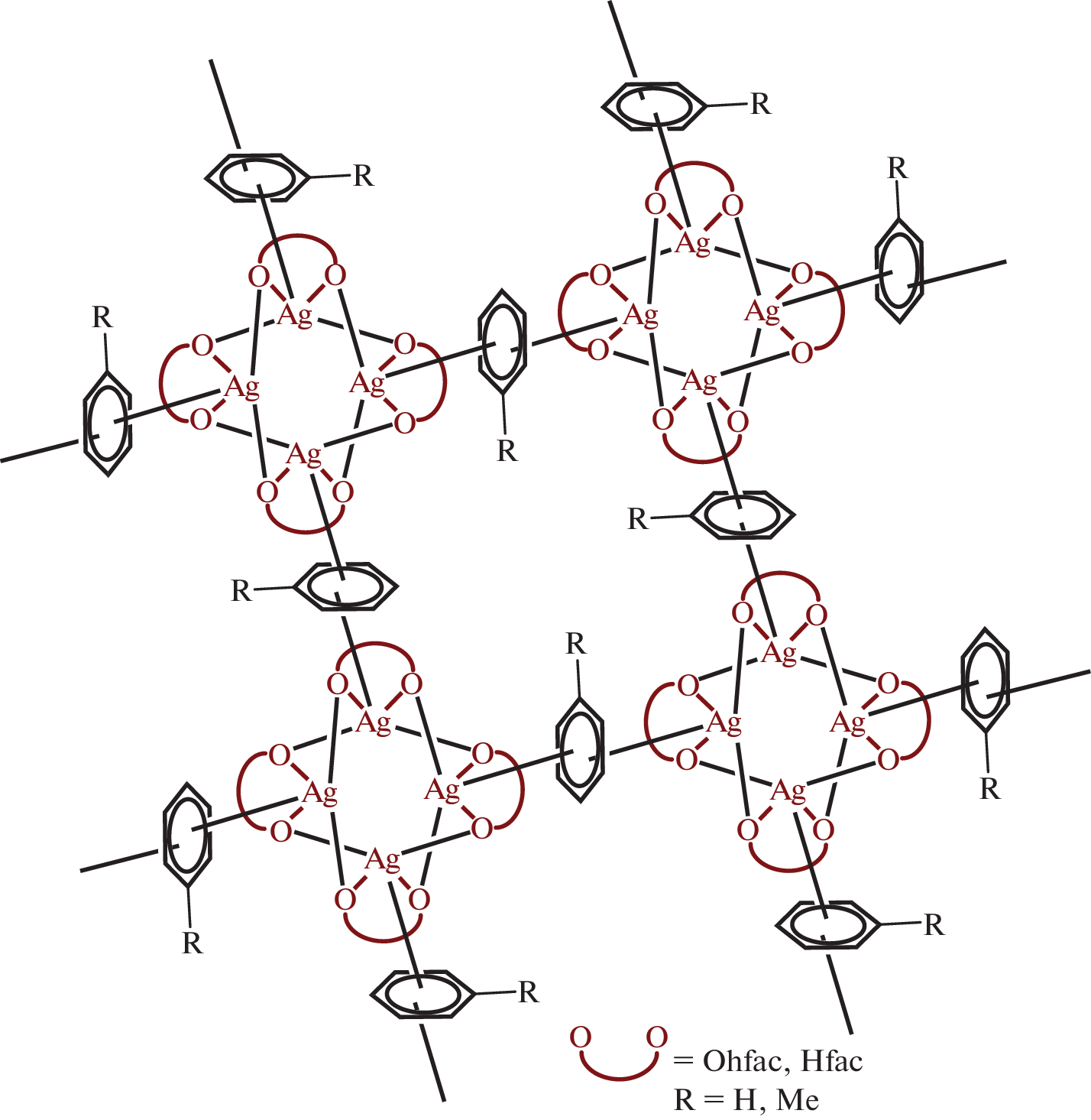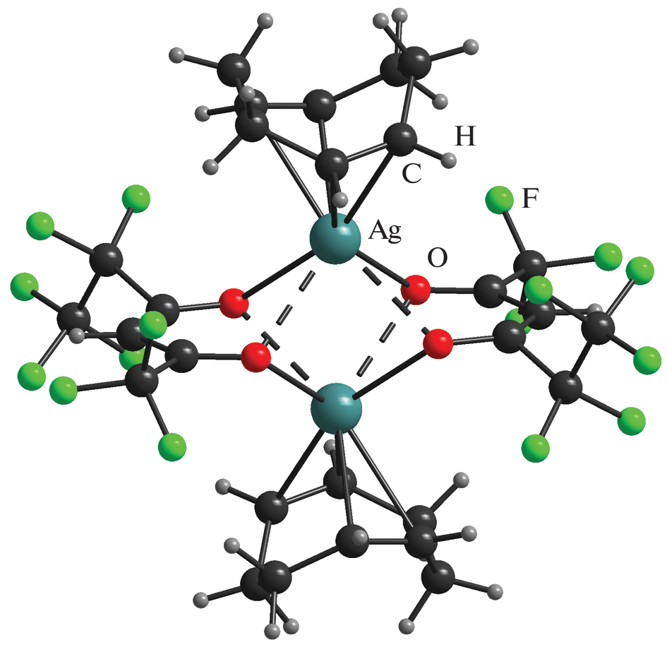Two new Ag(I) complexes with 1,1,1,5,5,6,6,6-octafluorohexane-2,4-dionate ion (Ofhac) and π‑donor neutral ligands, vinyltriethylsilane (VTES) or cycloocta-1,5-diene (COD), were synthesized with the goal to expand the library of silver precursors for chemical vapor deposition. The products were characterized by elemental analysis and IR and NMR spectroscopy. The complex [Ag(VTES)(Ofhac)] (I) was liquid under standard conditions; the temperature of its crystallization was below –20°C. Treatment of I with benzene gave rise to crystals of [Ag4(C6H6)2(Ofhac)4]∞ (II), which was confirmed by NMR and X-ray diffraction (CCDC no. 2232810). The structure of [Ag(COD)(Ofhac)]2 (III) was established by X-ray diffraction (CCDC no. 2232809). The binuclear molecules are formed due to the μ2-κ1(O):κ1(O') function of the Ofhac ligands (Ag–O, 2.458(2)–2.461(2) Å), while COD is κ2-η2:η2-coordinated (Ag–C, 2.420(17)–2.684(11) Å). The thermal properties of I and III in comparison with analogues containing 1,1,1,5,5,5-hexafluoropentane-2,4-dionate ion (Hfac) were studied by thermogravimetry.