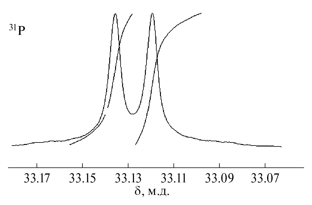 Существование лиганда в растворе в виде рацемической смеси двух энантиомеров подтверждено методом ЯМР 31Р{1H}. В спектре раствора L в L-PhCHMeNH2 (с = 0.1 моль/л) наблюдалось два синглетных сигнала равной интенсивности (рис. 2).