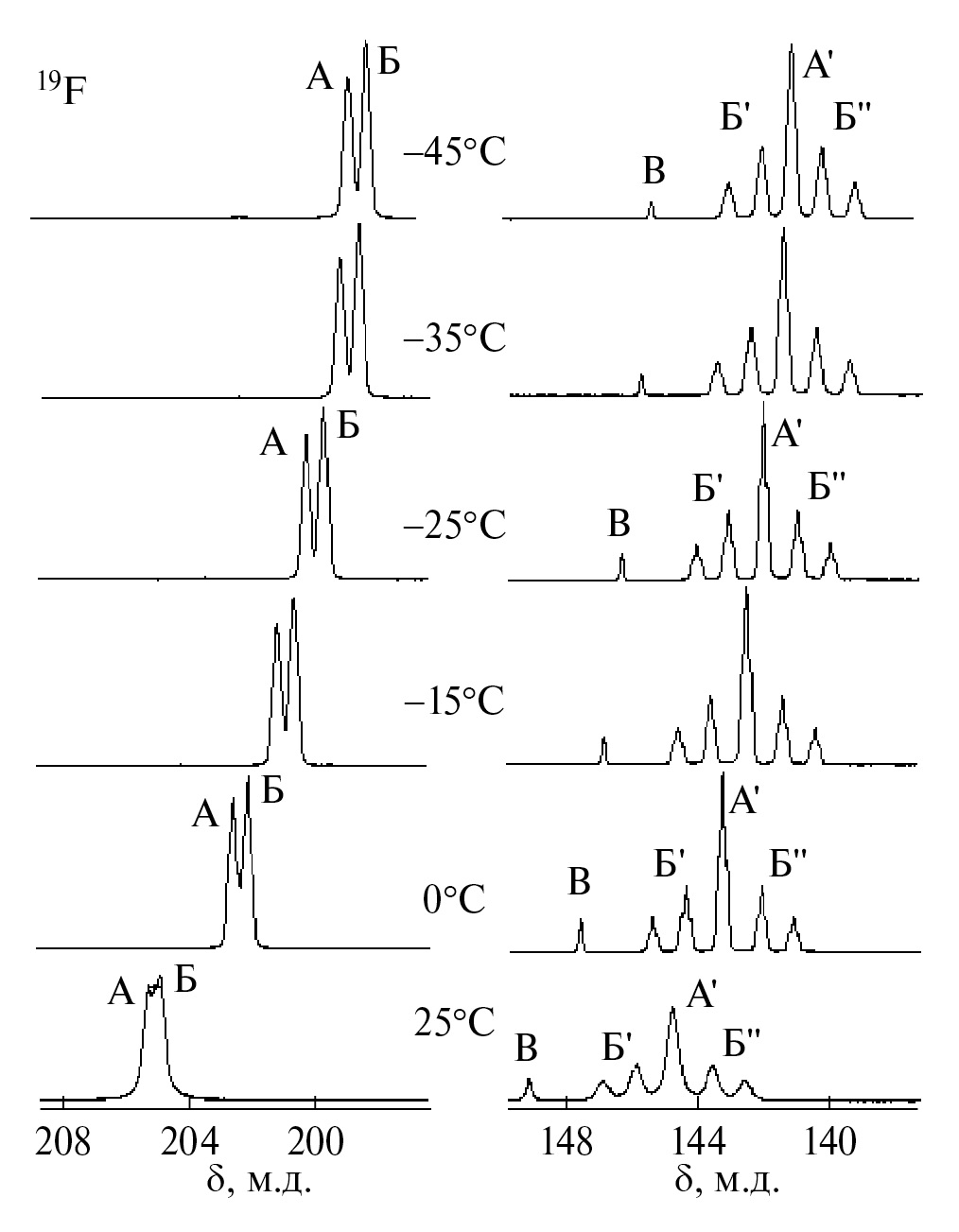 При комнатной температуре в спектре ЯМР 19F{1H} наблюдались две группы резонансных линий А, Б в области 205 м. д. и А', Б', Б'' – в области 145 м. д. (см. рис. 3). Положение этих сигналов и равенство суммарных интенсивностей указывало на присутствие в растворе двух тетрафторокомплексов титана цис-TiF4L2. При сравнении областей химических сдвигов с известными данными [4–6] линии А и Б в слабом поле мы отнесли к резонансным сигналам атомов фтора F2, находящимся в транс-положении к группам Р = О на ординатах октаэдра F2—Ti–OP…L, а сигналы Б', А', Б'' в более сильном поле – к атомам фтора F1, расположенным в транс-положении друг к другу, на ординате F1—Ti–F1.