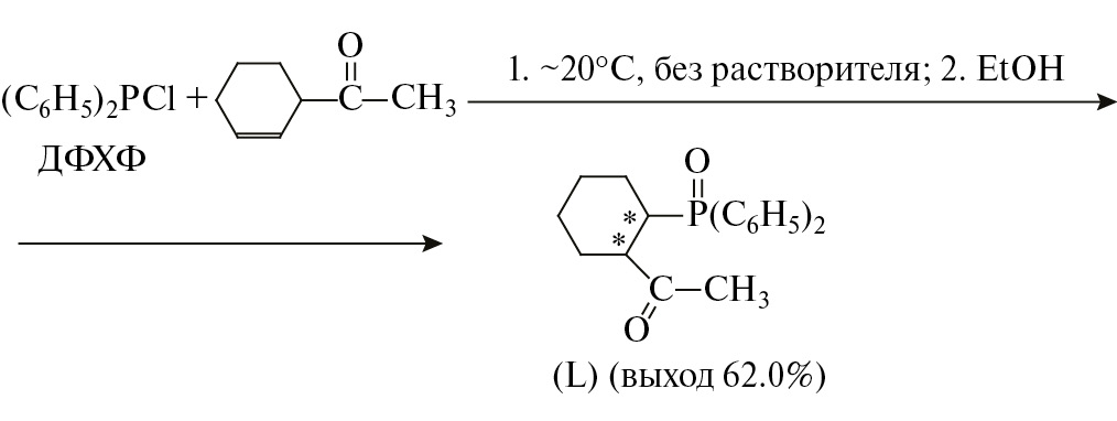 На первой стадии этого процесса ДФХФ взаимодействует с 1-ацетилциклогексеном в отсутствие растворителя при комнатной температуре с образованием твердого аддукта, который при обработке абсолютным этанолом превращается в соответствующее целевое соединение. Необходимо отметить, что данный процесс протекает стереоспецифично и образующийся лиганд L, по данным спектров ЯМР, представляет собой лишь один из двух теоретически возможных рацемических диастереомеров.