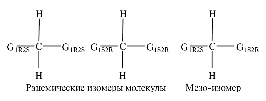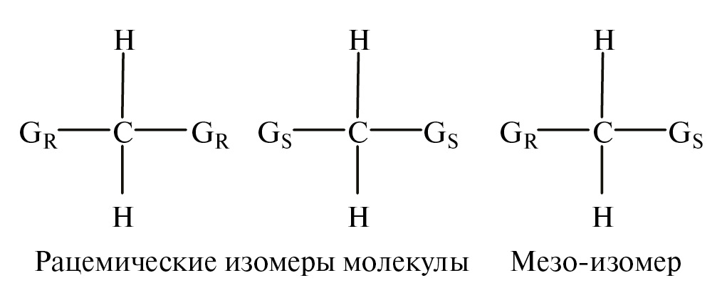 Для отнесения групп линий А, А' и Б, Б', Б'' в спектрах ЯМР 19F к возможным диастереоизомерам комплекса цис-TiF4L2 были взяты за основу фундаментальные работы по определению стереохимической конфигурации хиральных молекул органических соединений методами спектроскопии ЯМР [15, 16]. В частности, рассмотрение органических молекул, имеющих два асимметрических центра, разделенных углеродным атомом. Молекулы, содержащие симметрично расположенные хиральные группы (GR, GS), разделенные одним атомом углерода, существуют в формах мезо- или оптически неактивного изомера и оптически активных рацемических изомеров (схема 2) [17]. Для таких молекул соотношения симметрии между протонами позволяют различать мезо- и рацемические изомеры методом ЯМР [18].