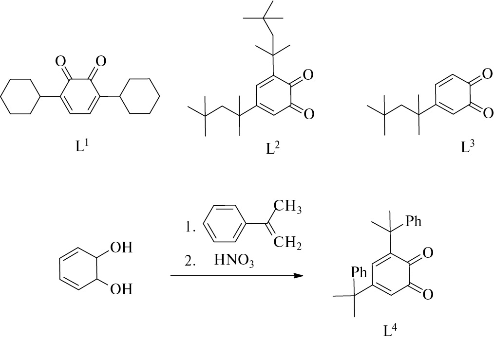 Замещенные о-бензохиноновые лиганды I и III синтезировали по известным методикам [29, 30]. 3,5-бис(2-фенилпропан-2-ил)-о-бензохинон (L4) получали по реакции алкилирования пирокатехина α-метилстиролом в присутствии бис-катехолата титана с последующим окислением образующегося на первой стадии пирокатехина азотной кислотой (схема 1).