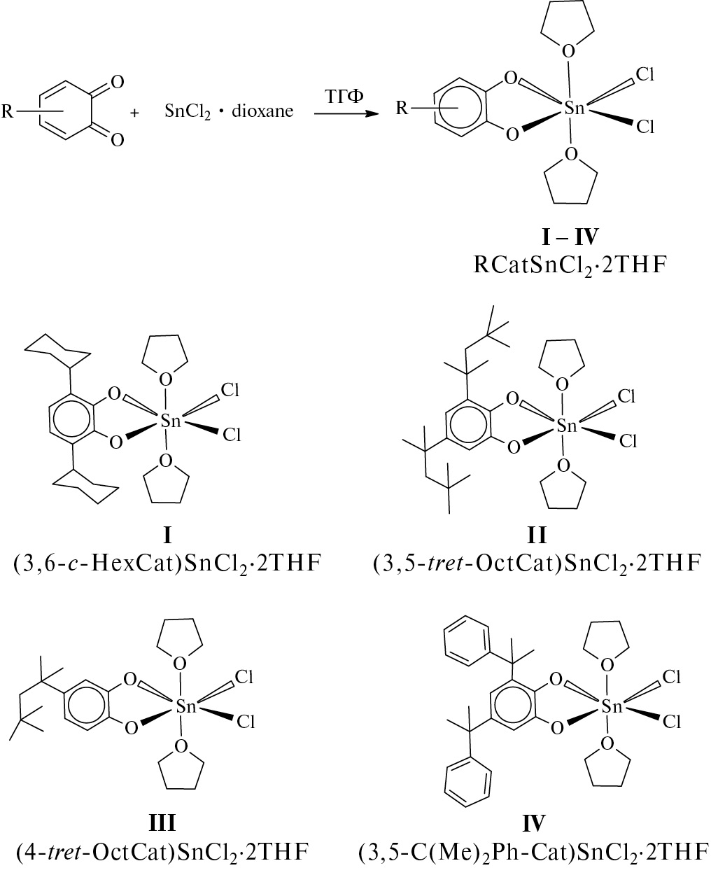 Общая методика синтеза комплексов I–IV на основе замещенных о-бензохинонов. Раствор замещенного o-бензохинона (1 экв) в ТГФ (10 мл) добавляли к раствору SnCl2 · dioxane (1 экв) в 20 мл того же растворителя. Цвет реакционной смеси менялся от зеленого до желтого или коричневого. ТГФ упаривали при пониженном давлении досуха и остаток растворяли в смеси растворителей CH2Cl2-гексан в соотношении 1 : 1. Комплексы олова(IV) выделяли в виде желтых мелкокристаллических осадков, после выдерживания раствора при –18°C в течение ночи. Пригодные для РСА кристаллы получили для комплексов I и III. Все полученные катехолатные комплексы олова I – IV чувствительны к кислороду и влаге воздуха в растворе и твердом состоянии.
