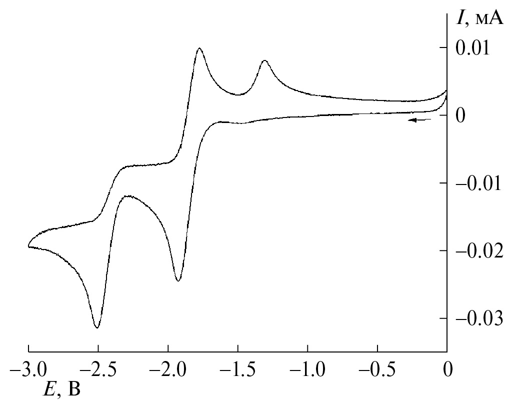 Рис. 1. Циклическая вольтамперограмма лиганда DippPDI (ТГФ, V = 0.2 В/с, относительно Ag+/Ag, с = 2 × × 10–3 моль/л, Pt-электрод, Ar, 0.1 M Bu4NBF4).