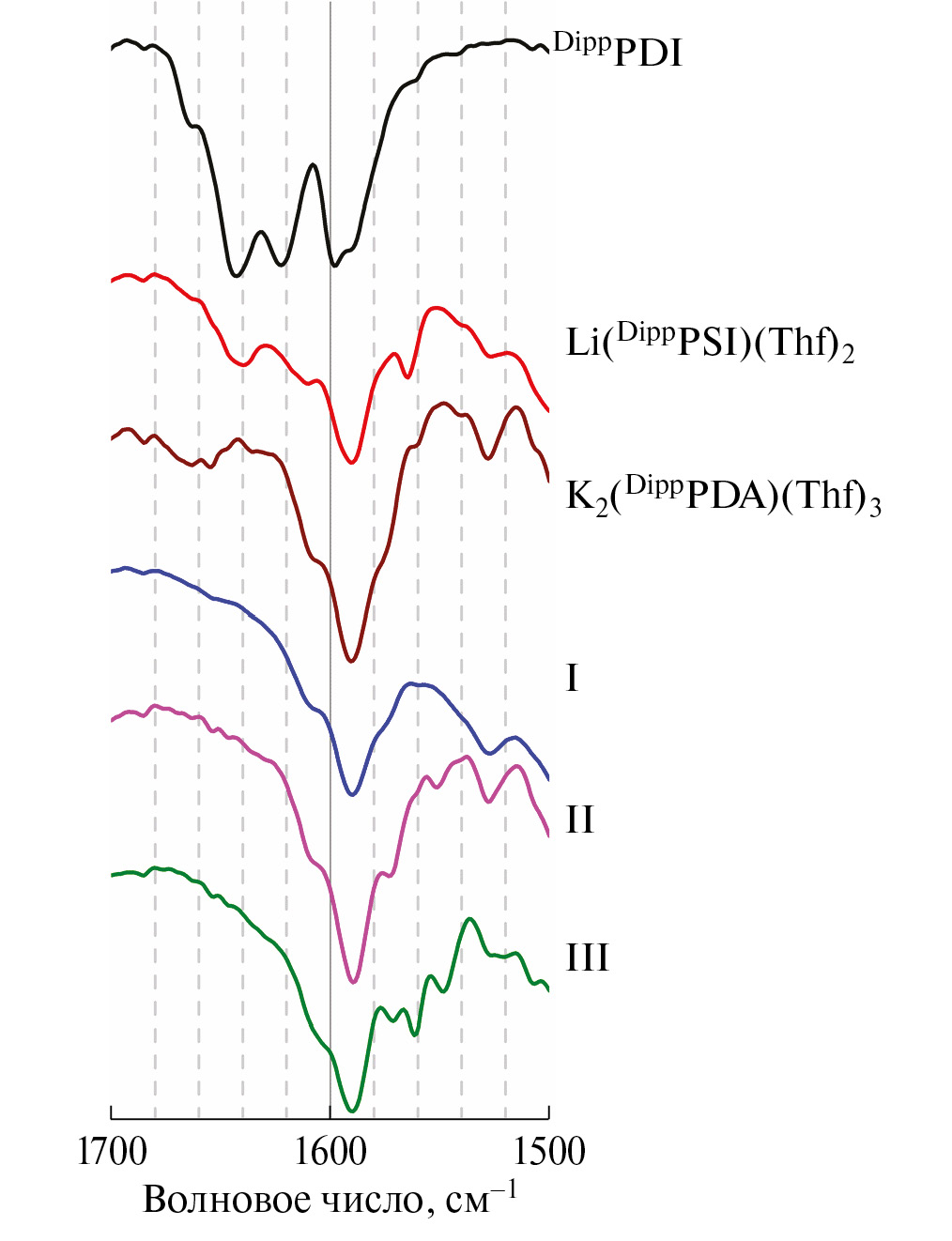 В ИК-спектрах DippPDI, [Li(DippPSI)(Thf)2], [K2(DippPDA)(Thf)3], I, II, III можно выделить полосы в средней области (1700–1500 см–1), соответствующие колебаниям сопряженной системы NCCN, наиболее сильно зависящие от степени окисления лиганда (рис. 2). Восстановление DippPDI в DippPSI2– приводит к последовательному уменьшению интенсивности и исчезновению коротковолновых полос на 1620–1650 см–1, длинноволновая полоса при 1595 см–1 остается практически без изменений.