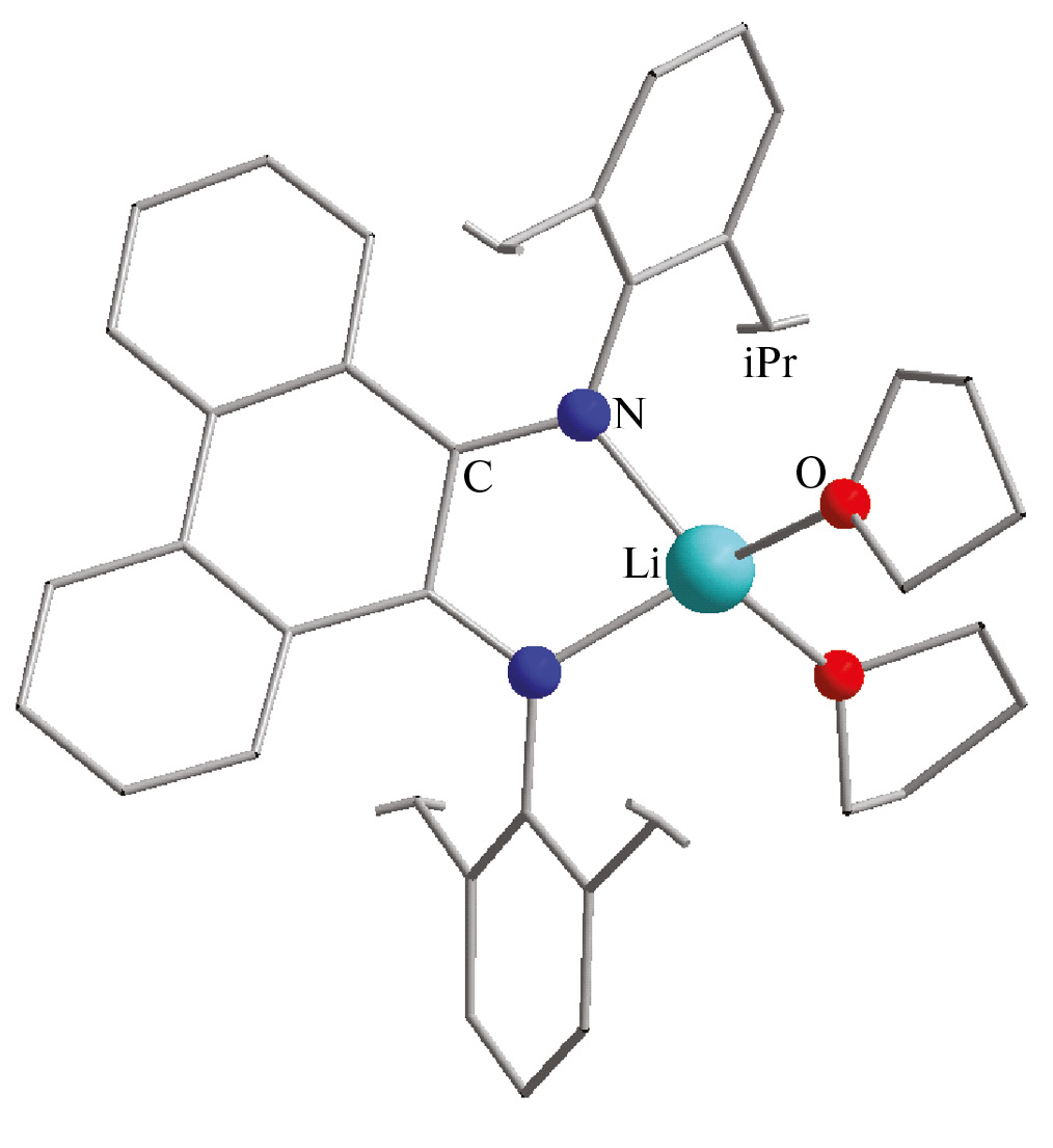 По сравнению с калиевой литиевая соль с анион-радикальной формой лиганда [Li(DippPSI)(Тhf)2] представляет собой моноядерный комплекс (рис. 4). Координационный полиэдр соединения можно описать как искаженный тетраэдр. Длины связей C–N и C–C в металлоцикле принимают промежуточные значения между длинами, характерными для нейтральной и дианионной форм (см. табл. 1), что подтверждает моноанионную форму лиганда.