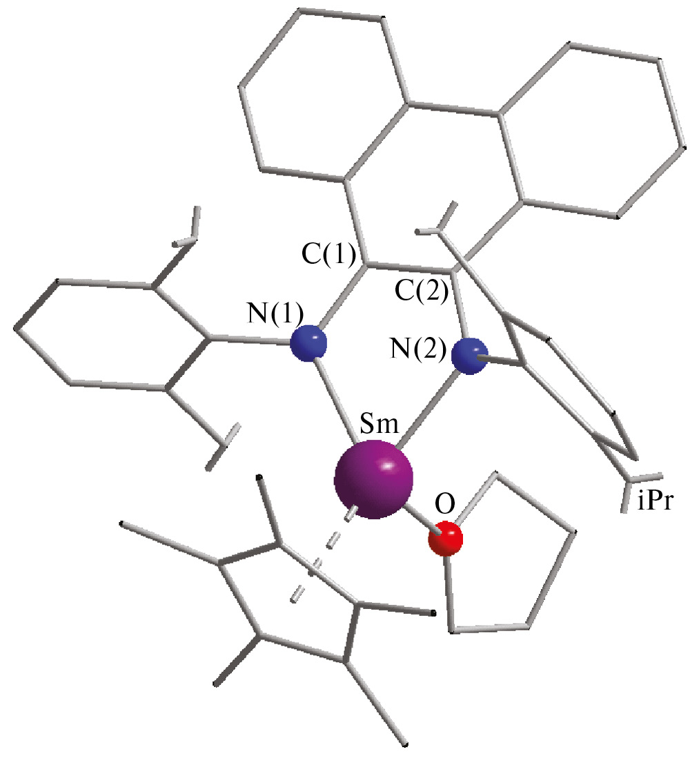 В комплексе самария I центральный атом координирован одним η5-циклопентадиенильным и одним фенантрендииминовым лигандом (рис. 5), координационная сфера дополняется молекулой ТГФ до координационного числа (КЧ) равного 6. Длины связей фрагмента NCCN металлоцикла близки к таковым в структуре калиевой соли [K2(DippPDA)(Thf)3] и соответствуют дианионной форме лиганда, DippPDA2– (см. табл. 1). Учитывая, что лиганд Cp*– несет заряд –1, атом самария находится в степени окисления +3. Объемный лиганд Cp*– находится в позиции, противоположной связям Sm–N; таким образом, вектор Sm–Cp* (центроид) незначительно отклоняется от плоскости SmN2 (на 34°). Такое расположение определяется взаимодействием с объемными заместителями DippPDA2–: метильные группы Cp* расположены практически вплотную к ароматическим циклам обеих групп Dipp, и более близкое расположение Cp* невозможно по стерическим причинам. Как следствие, менее объемный лиганд ТГФ занимает оставшееся место в координационной сфере и связь Sm–O направлена в сторону от хелатного цикла (угол с плоскостью SmN2 составляет 78°).