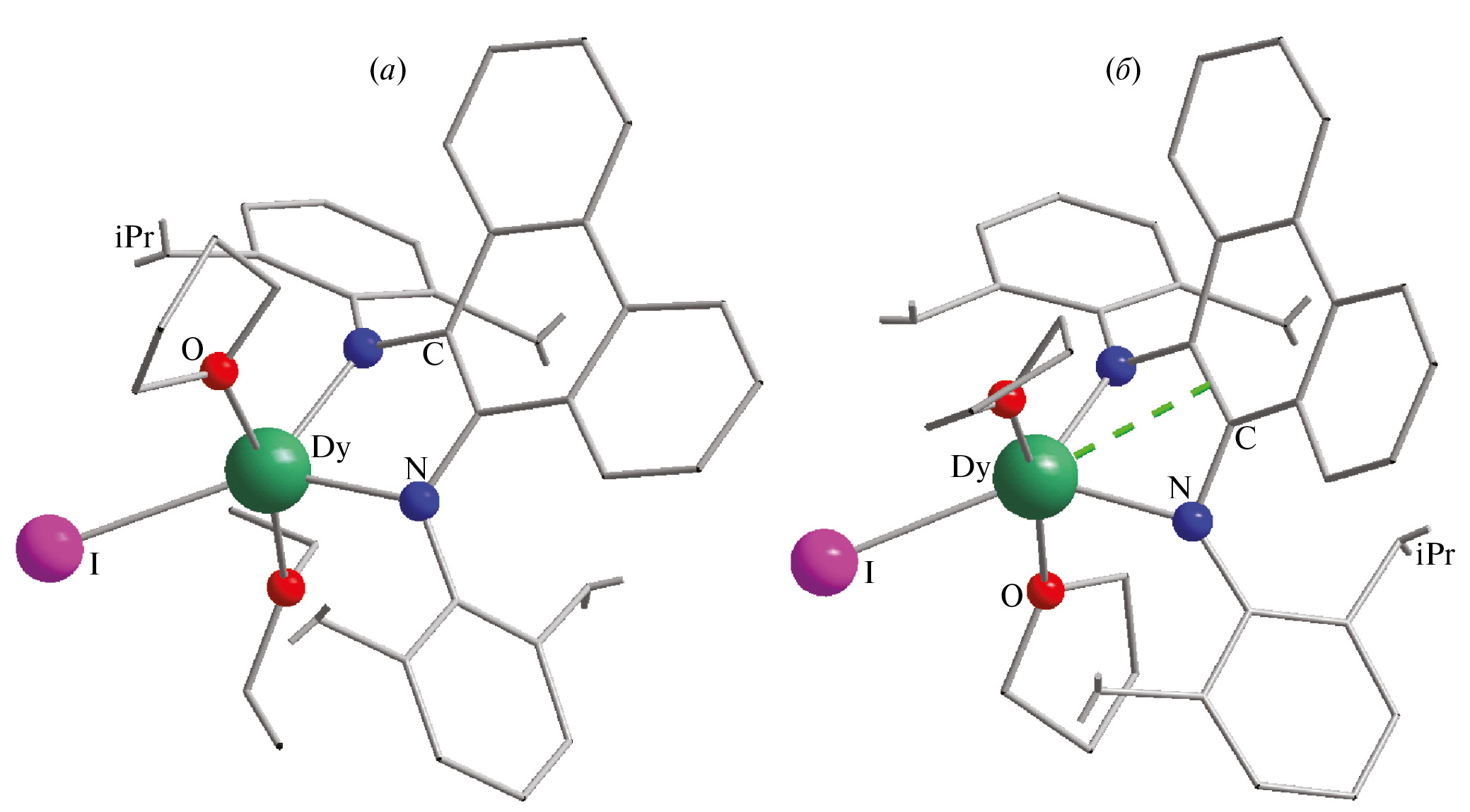 В структурах IIThf и IIEt2O координационные полиэдры практически одинаковы и представляют собой искаженную тригональную бипирамиду с атомами азота и иода в экваториальных положениях и двумя атомами кислорода в аксиальных (DyIO2N2, КЧ 5; рис. 6). Дииминовый лиганд находится в дианионном состоянии, что следует из состава комплекса и подтверждается характерными значениями длин связей C–N и C–C в хелатном цикле (см. табл. 1). Структура комплекса IIThf содержит две независимые молекулы. Длины подобных связей в координационном узле практически не отличаются для этих двух молекул, а также между комплексами IIThf и IIEt2O. Аналогично комплексу I, объемный лиганд (I–) расположен напротив донорных атомов азота в позиции, максимально удаленной от заместителей Dipp дииминового лиганда. Угол связи Dy–I с плоскостью DyN2 составляет 12° и 13° для IIThf и 0° для IIEt2O. Оставшиеся два доступных координационных места заняты нейтральными донорными молекулами ТГФ или Et2O; связи Dy–O практически перпендикулярны плоскости DyN2 (углы с этой плоскостью для всех таких связей лежат в интервале 73°—86°).