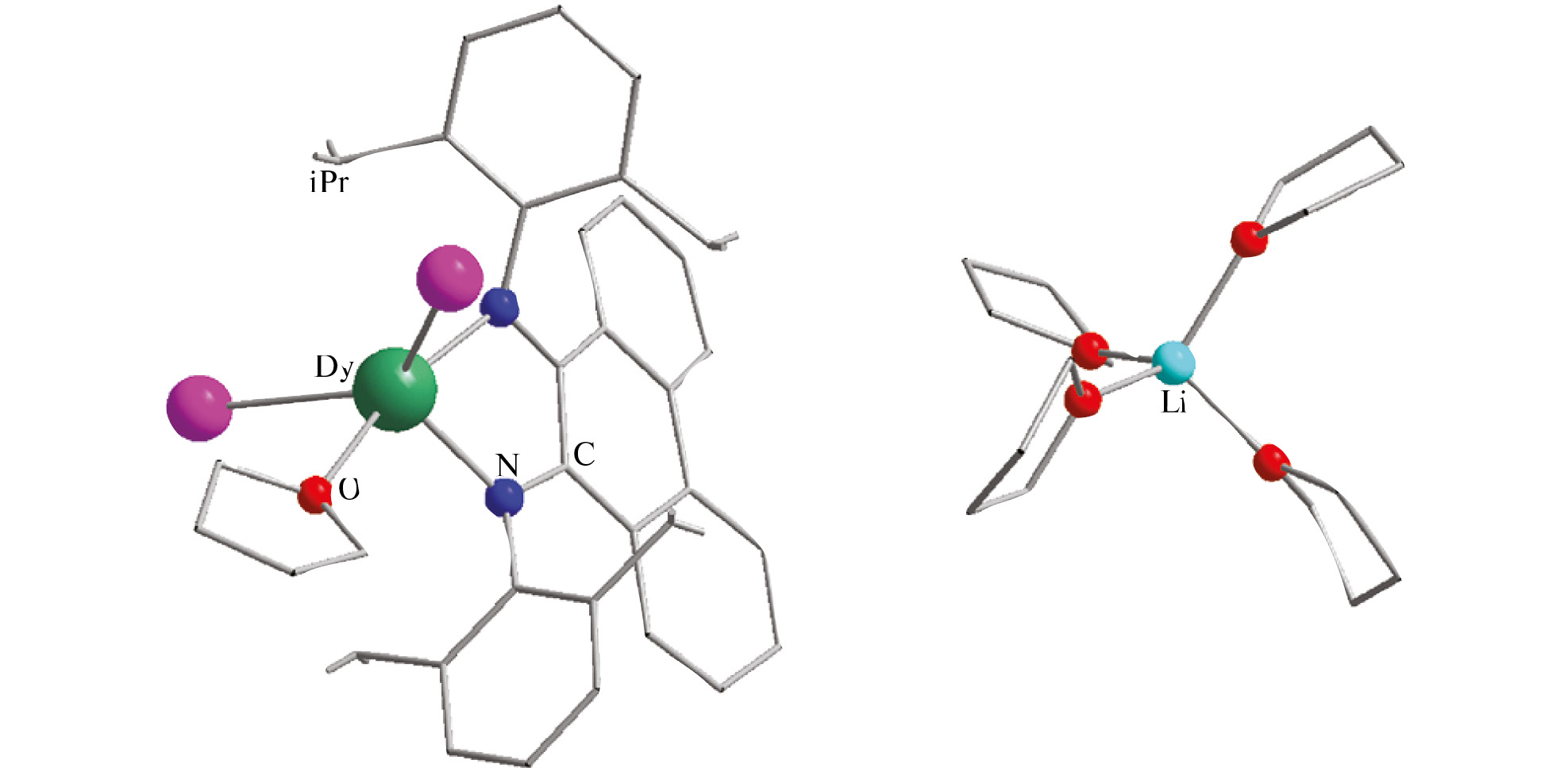 были получены две кристаллические фазы: с катионами [Li(Thf)4]+ (рис. 7) и [Li(Thf)3(Et2O)]+. Структура с первым катионом включает две кристаллографически независимые пары катион – анион. Геометрия анионных комплексов в обеих структурах одинакова, окружение центрального атома DyI2ON2 (КЧ 5). По сравнению с комплексом II включение в координационную сферу еще одного большого иодид-аниона приводит к существенным изменениям в относительном расположении лигандов. Два иодид-аниона не могут находиться так же близко к дииминовому лиганду, как молекулы Et2O, из-за взаимодействия с объeмными заместителями Dipp. Поэтому связи Dy–I заметно отклонены от перпендикуляра к плоскости DyN2 (на 62° и 68°). Оба атома иода расположены практически вплотную к одному из двух заместителей Dipp; оставшееся место вблизи второго заместителя занимает одна молекула ТГФ. Поскольку положения по сторонам от плоскости DyN2 заняты атомами иода, связь Dy–O находится близко к этой плоскости, образуя с ней угол в 10°.