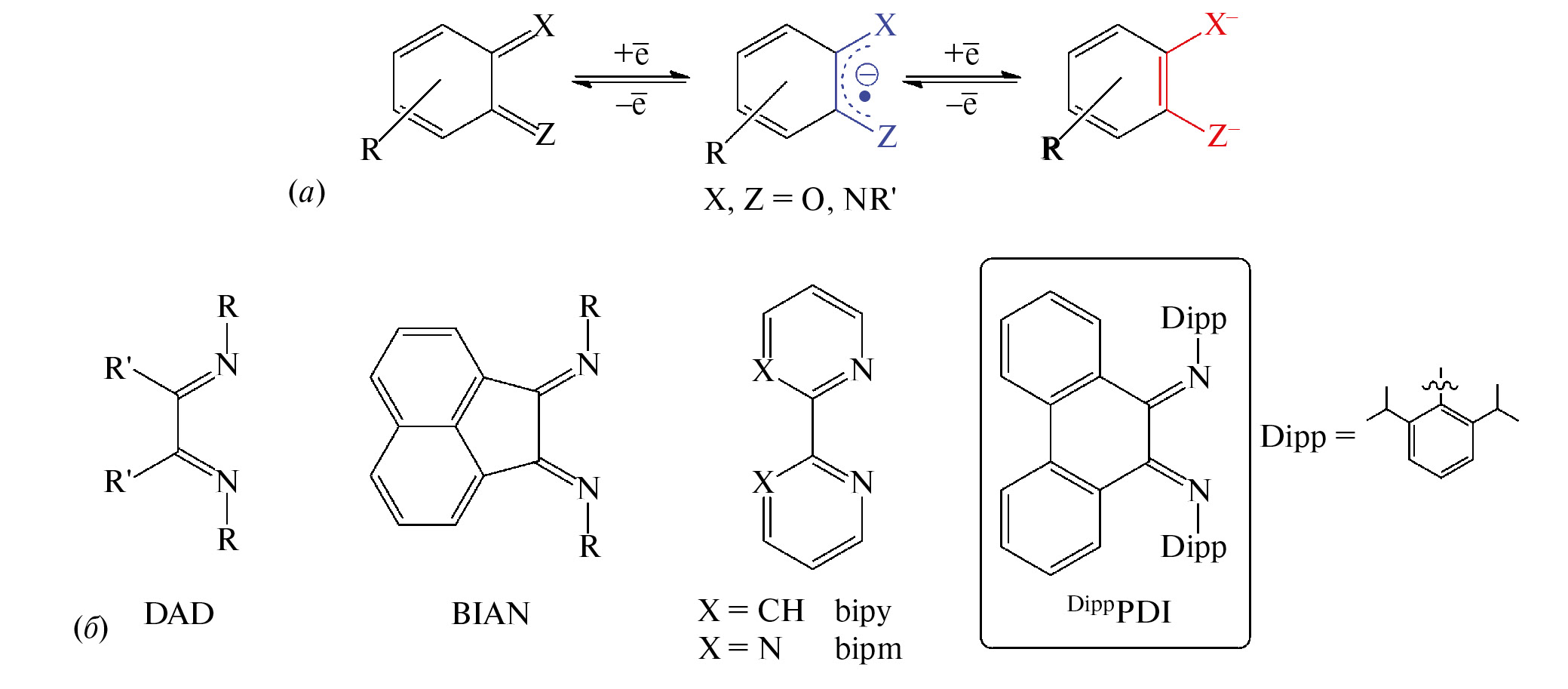 Схема 1. Обобщенное строение изучаемых лигандов и редокс-переходы в них (а); наиболее исследованные типы дииминовых редокс-активных лигандов и лиганд, изучаемый в этой работе (б).