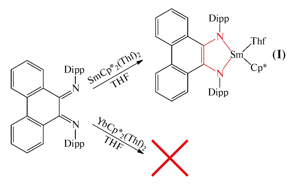 Для получения комплексов лантаноидов с 9,10-N-(2,6-диизопропилфенил)-о-фенантрендиимином (DippPDI) были использованы две разные методики: в первой – окислительно-восстановительные реакции между нейтральным диимином и лантаноценами [LnCp*2(Тhf)2] (Ln = Sm, Yb), а во второй – обменные реакции между трииодидом диспрозия DyI3(Тhf)3,5 и солью лиганда с щелочным металлом. В первой методике эксплуатируется хорошая восстановительная способность лантаноценов (за счет окисления как лантаноида, так и лиганда Ср*–), однако эти исходные комплексы доступны только для нескольких лантаноидов; вторая методика не накладывает таких ограничений. В реакции [SmCp*2(Тhf)2] и DippPDI (схема 2) в ТГФ отчетливо наблюдаются два этапа: сначала (в течение часа) происходит восстановление лиганда до анион-радикальной формы, раствор при этом становится фиолетового цвета. Затем он в течение нескольких часов становится темно-красного цвета, что говорит о появлении дианионной формы. Темно-красные кристаллы комплекса [SmCp*(DippPDA)(Тhf)] (I) были выделены из смеси ТГФ – гексан (1 : 3 по объему).