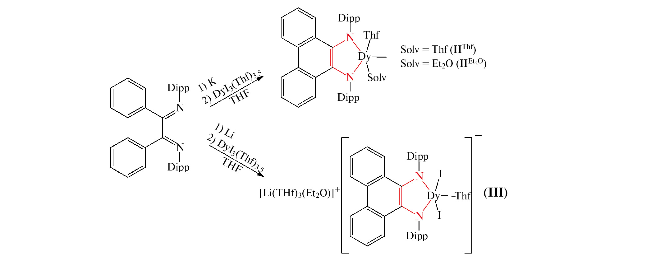The complex formation of the redox-active ligand bis(N, N’-2,6-diisopropylphenyl)-9,10-phenanthrenediimine (DippPDI) with alkaline metal (Li, K) and lanthanide (Sm, Dy) cations is studied. The reduction of DippPDI with an alkaline metal excess affords the dianionic form of the ligand (DippPDA2–), which crystallizes with the potassium cation as the coordination polymer [K2(DippPDA)(Thf)3] (Thf is tetrahydrofuran, THF). The reaction of equimolar amounts of the lithium salt with the dianionic form of the ligand and neutral diimine affords the lithium complex with the radical-anion form (DippPSI•–) crystallized as [Li(DippPSI)(Thf)2]. The samarium(III) complex [SmCp*(DippPDA)(Тhf)] (I) is formed by the reduction ofDippPDI with samarocene [Sm (Thf)2] (Cp* is pentamethylcyclopentadienide): both the samarium(II) cation and Cp*– anion are oxidized in the reaction.DippPDI does not react with similar ytterbocene. The dysprosium(III) complexes are synthesized by the ion exchange reactions between DyI3(Thf)3.5 and potassium or lithium salt with theDippPDA2-dianion. Similar complexes [Dy(DippPDA)I(Thf)2] (IIThf) and [Dy(DippPDA)I(Thf)(Et2O)] () are formed in the reactions with the potassium salt depending on the solvent used: a THF-hexane or a diethyl ether-n-hexane mixture, respectively. The coordination of the dysprosium cation by the π system of the conjugated fragment of the NCCN ligand is observed in IIThf, whereas in this coordination is absent. The reaction with Li2(DippPDA) affords the binary complex salt [Li(Тhf)3(Et2O)][DyI2(DippPDA)(Тhf)] (III, crystallization from a THF-Et2O mixture). The crystallization from THF gives the [Li(Тhf)4][DyI2(DippPDA)(Thf)] salt (III') containing the same anion as III. The structures of all new complexes are studied by X-ray diffraction (XRD, CIF files CCDC nos. 2260307–2260313).