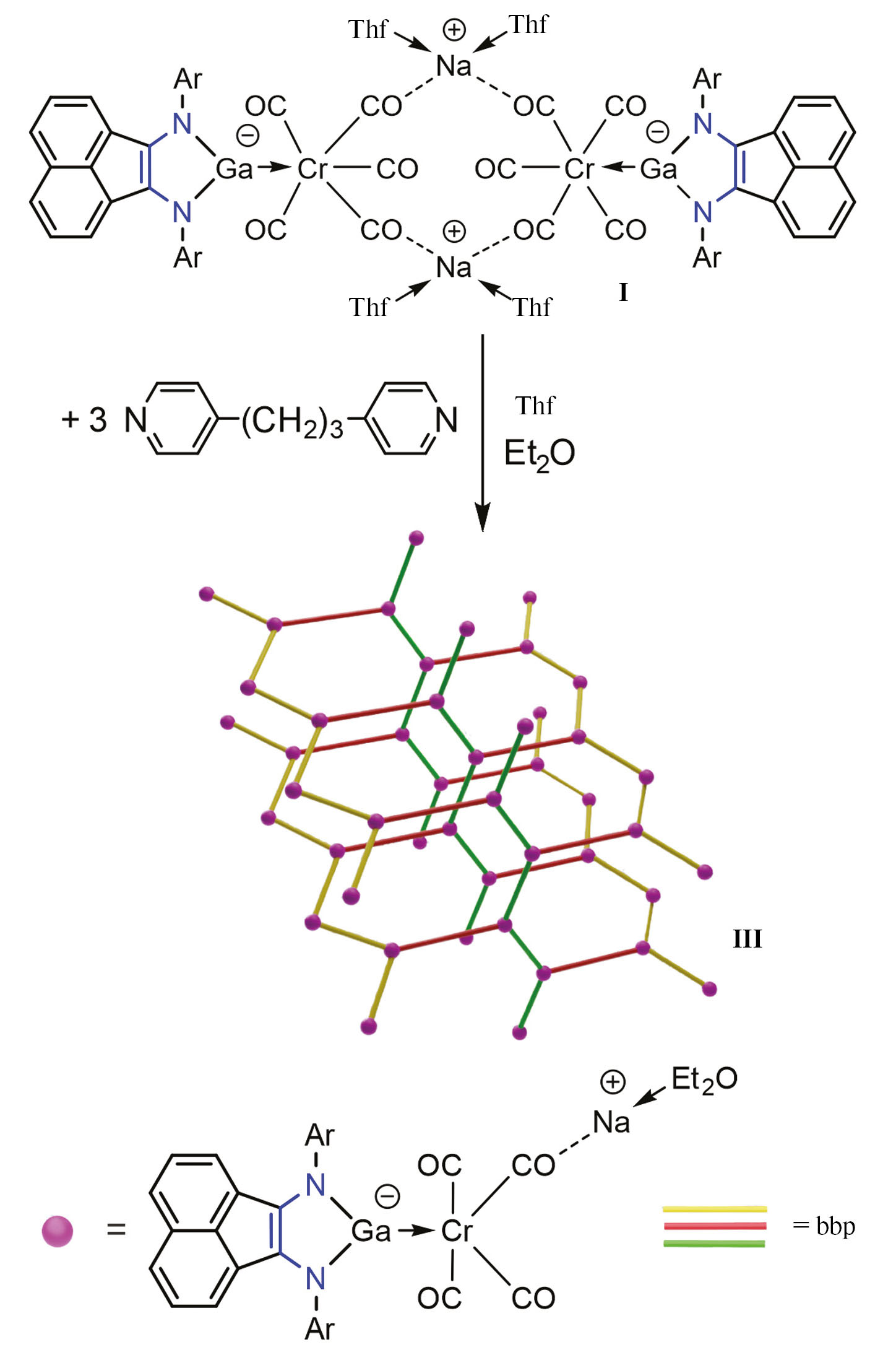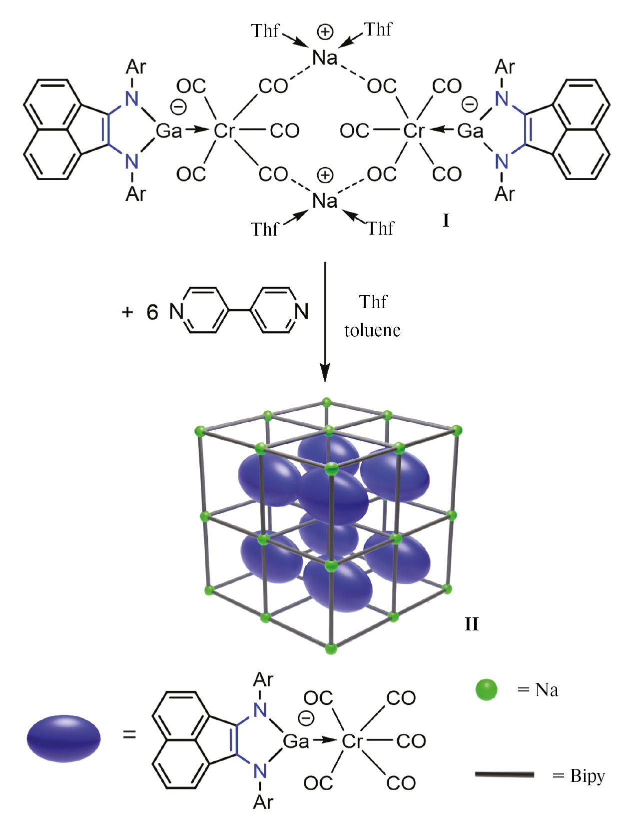 Реакция комплекса [(Dpp-bian)GaCr(CO)5]2[Na(Thf)2]2 (I) с шестью мольными эквивалентами 4,4′-бипиридина в тетрагидрофуране приводит к образованию трехмерного координационного полимера [{(Dpp-bian)GaCr(CO)5}{Na(4,4′-Bipy)3}]n (II) (cхема 1). Продукт реакции выделен в виде зеленых кристаллов из смеси растворителей ТГФ — толуол с выходом 62%. Образование 3D-цепи II происходит посредством координации нейтральных молекул Bipy катионами натрия, при этом свободные анионы {(Dpp-bian)GaCr(CO)5} расположены внутри ячеек МОКП.