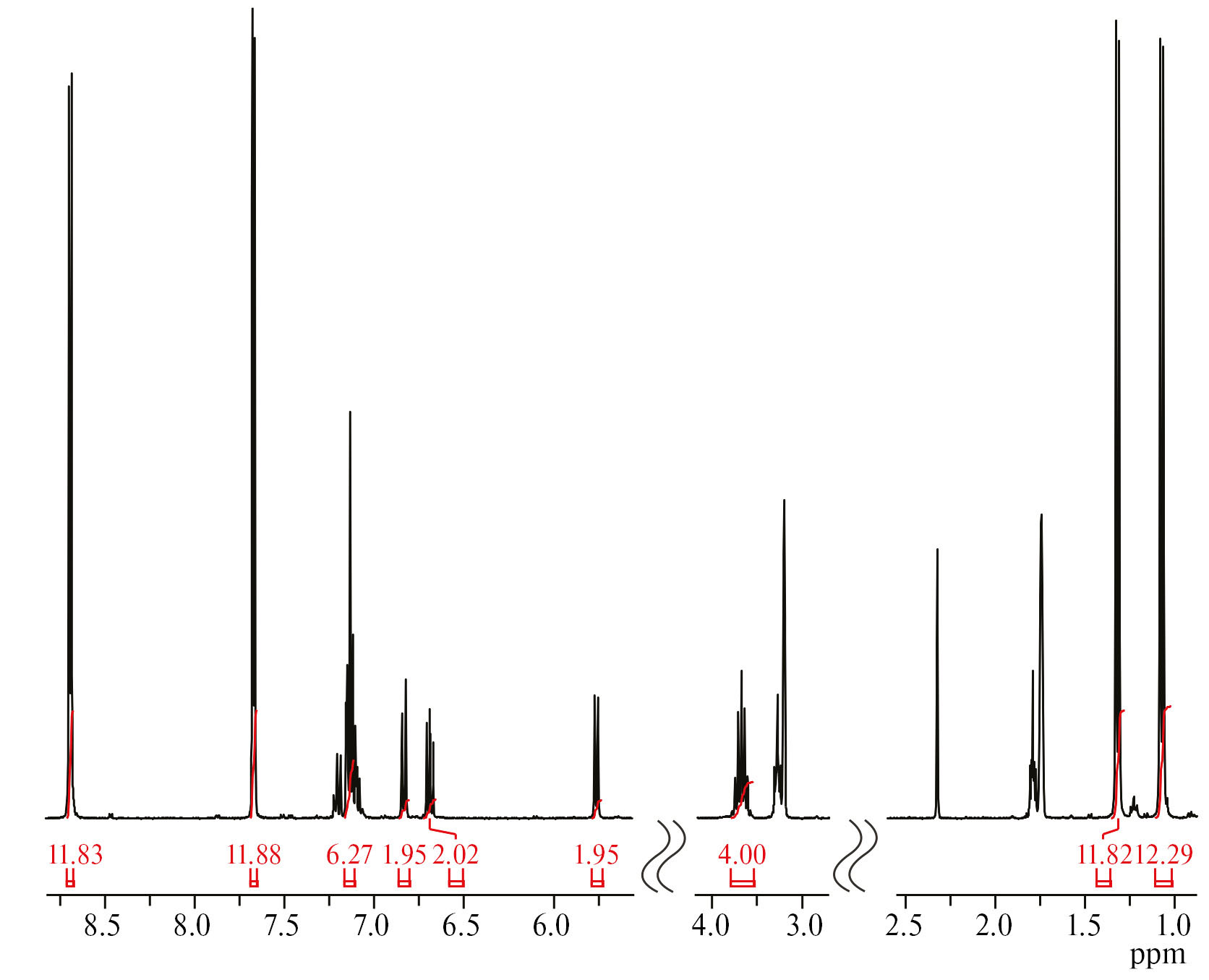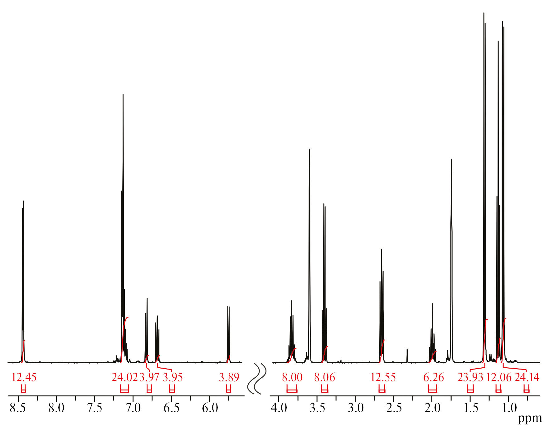 Спектр ЯМР 1Н (400 МГц; C4D8O; 298 К; δ, м.д.; J, Гц): 8.44 (d., 12Н, J = 6.0, Bpp), 7.17—7.06 (м., 24Н, Bpp + Ar), 6.83 (д., 4Н, J = 7.0, Ar), 6.69 (д., 2Н, J = 6.8, Ar), 6.67 (д., 2Н, J = 7.0, Ar), 5.75 (д., 4Н, J = 6.8, Ar), 3.83 (септ., 8Н, J = 6.8, CH-i-Pr), 3.40 (кв., 8Н, J = 7.0, Et2O), 2.66 (т., 8Н, J = 7.5, Bpp), 1.99 (п., 6Н, J = 7.7, Bpp), 1.31 (д., 24Н, J = 7.0, CH3-i-Pr), 1.13 (т., 13Н, J = 6.8, Et2O), 1.07 (д., 24Н, J = 7.0, CH3-i-Pr).