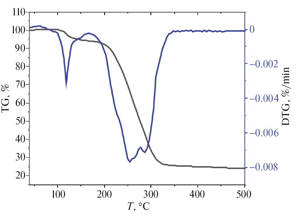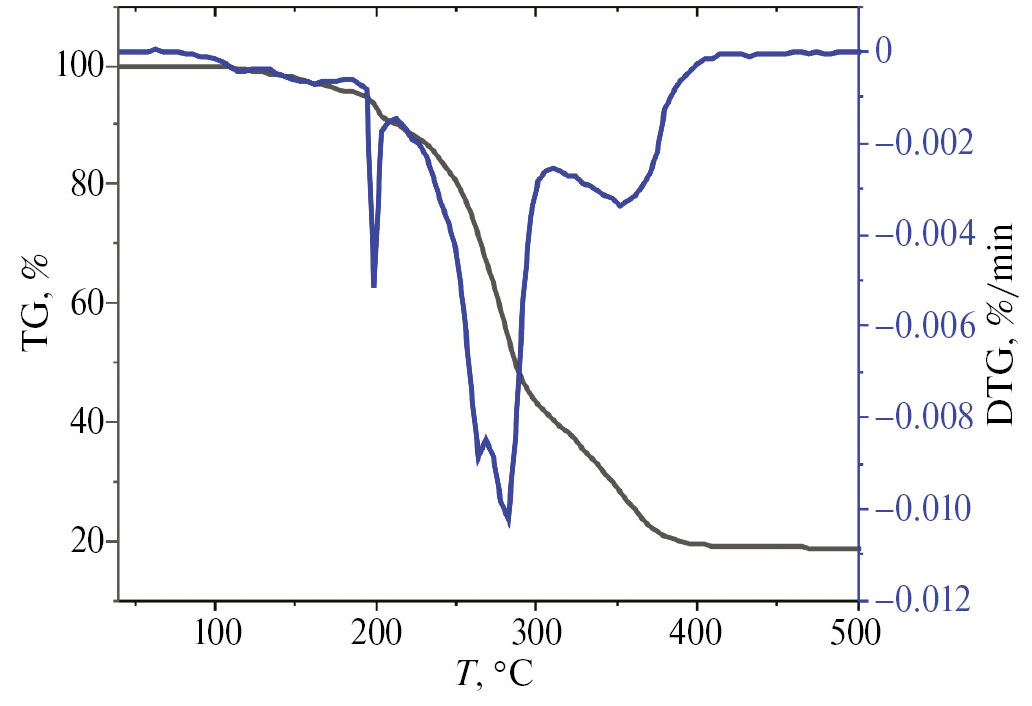 Для комплекса II был выполнен термогравиметрический анализ (рис. 2). Согласно данным ТГА наблюдается три стадии тепловых процессов до полного разложения соединения. Первый этап (194—208˚C, Vmax при 198˚C) демонстрирует высвобождение тетрагидрофурана, содержащегося в кристаллической ячейке. Вторая стадия (208—306˚C, Vmax при 282˚C) показывает выделение толуола, CO и 4,4′-Bipy. Дальнейшее нагревание (306—413˚C, Vmax при 352˚C) приводит к разложению оставшегося комплекса и образованию аморфных продуктов. Количественно оценить потери массы на каждой из стадий трудно, поскольку они накладываются друг на друга.