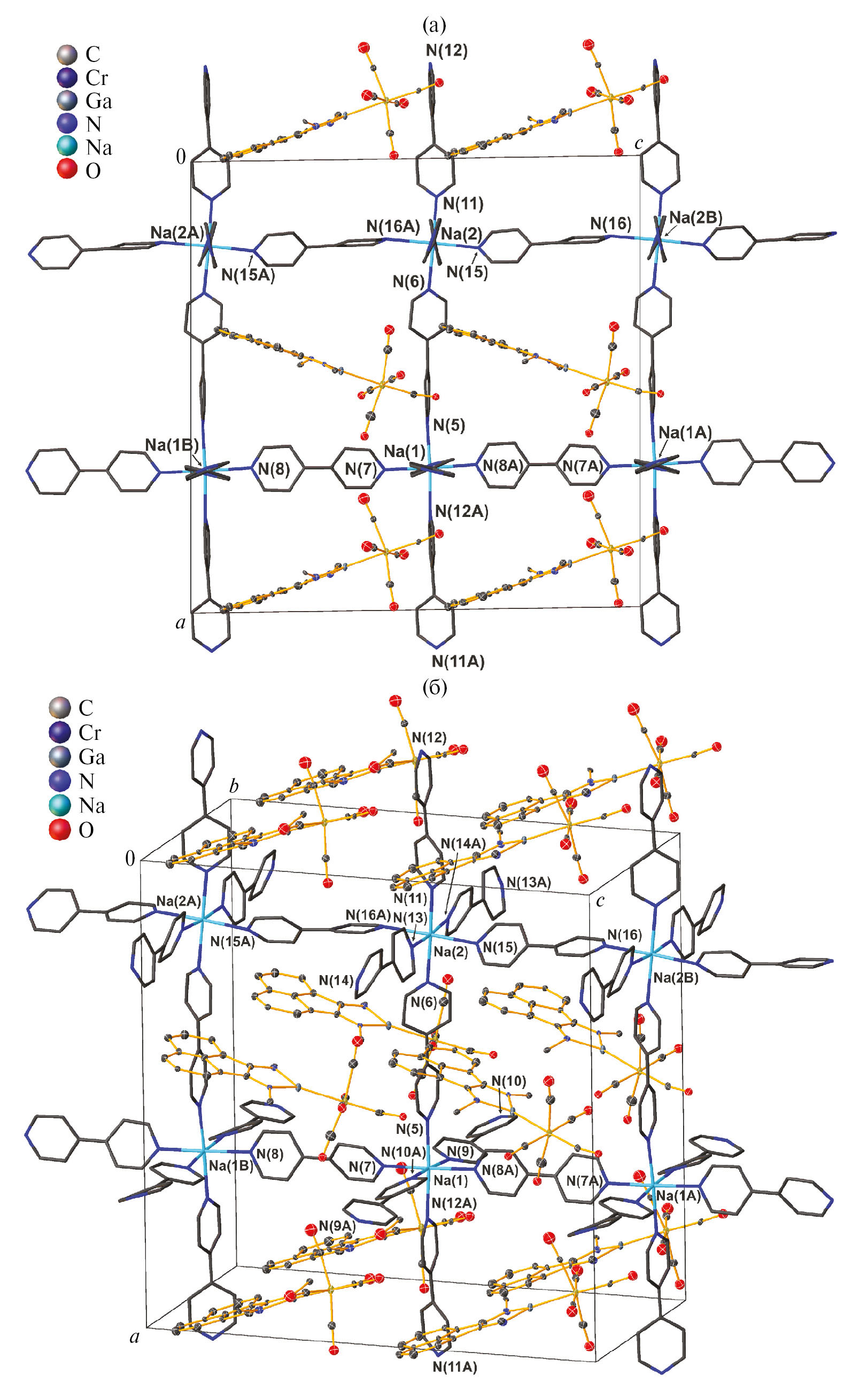 По данным РСА, в кристаллическом состоянии соединение II представляет собой координационный полимер, состоящий из катионного натрий-бипиридинового 3D-каркаса {Na(4,4′-Bipy)}+n, в полостях которого расположены молекулы гетеробиметаллического аниона {(Dpp-bian)GaCr(CO)5}–, а также молекулы растворителей — толуола и тетрагидрофурана (рис. 3). Ассиметричная часть ячейки II содержит дикатионный фрагмент Na2(4,4′-Bipy)62+ с атомами Na(1,2)N(5—16), две анионные молекулы {(Dpp-bian)GaCr(CO)5}– и по одной молекуле толуола с ТГФ (см. рис. 3, б). Полимерный каркас {Na(4,4′-Bipy)}+n имеет топологию примитивной кубической решетки pcu.