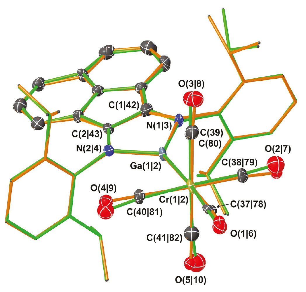 Рис. 4. Суперпозиция двух независимых молекул ионного комплекса (Dpp-bian)GaCr(CO)5 в II. Представлены тепловые эллипсоиды с 30%-ной вероятностью. Атомы водорода не показаны. Через символ “|” приведена нумерация для первой и второй молекул (Dpp-bian)GaCr(CO)5 (с зелеными и коричневыми связями) соответственно.