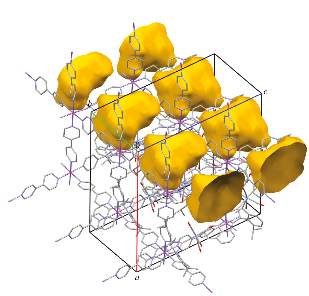 К сожалению, с помощью рентгеноструктурного анализа удалось установить только взаимное расположение атомов в кристаллах комплекса III. По данным РСА, соединение III представляет собой 3D-координационный полимер (рис. 8), в котором атомы натрия связываются между собой лигандами мостиковыми Bpp и дополнительно координируют молекулы аниона {(Dpp-bian)GaCr(CO)4}– и диэтилового эфира. Мономерное звено в III представлено фрагментом [{(Dpp-bian)GaCr(CO)4Na(Et2O)(Bpp)}(μ-Bpp){(Et2O)(Bpp)Na(CO)4CrGa(Dpp-bian)}] (см. рис. 3, а). Тригонально-бипирамидальное окружение атома натрия формируют три атома азота от трех разных лигандов Bpp и два атома кислорода: один от карбонильного лиганда CO и один от диэтилового эфира. Структура 3D-координационного полимера III относится к топологическому типу ths. Рассчитанный с помощью программы Platon [38] доступный для растворителя объем равен 542.1 Å3, что составляет 4.4% объема элементарной ячейки (рис. 9).