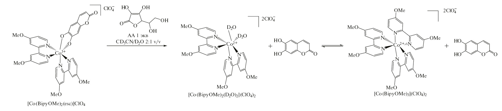 В настоящей работе нами синтезирован новый редокс-активный комплекс кобальта(III) [Co(BipyOMe)2(esc)]ClO4 (I), содержащий в качестве лигандов 4,4′-диметокси-2,2′-бипиридин и 2-оксо-2Н-хромен-6,7-диолат дианион (схема 1), и исследовано его восстановление аскорбиновой кислотой in situ с помощью спектроскопии ЯМР.