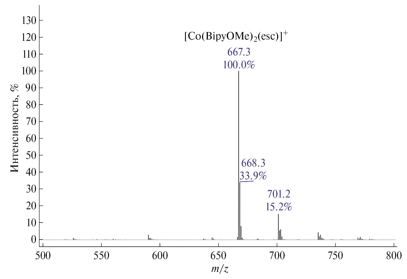 Масс-спектр (ESI), m/z: [Co(BipyОМе)2(esc)]+, рассчитано — 667.1, найдено — 667.3.