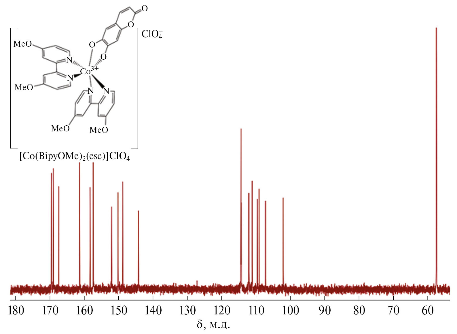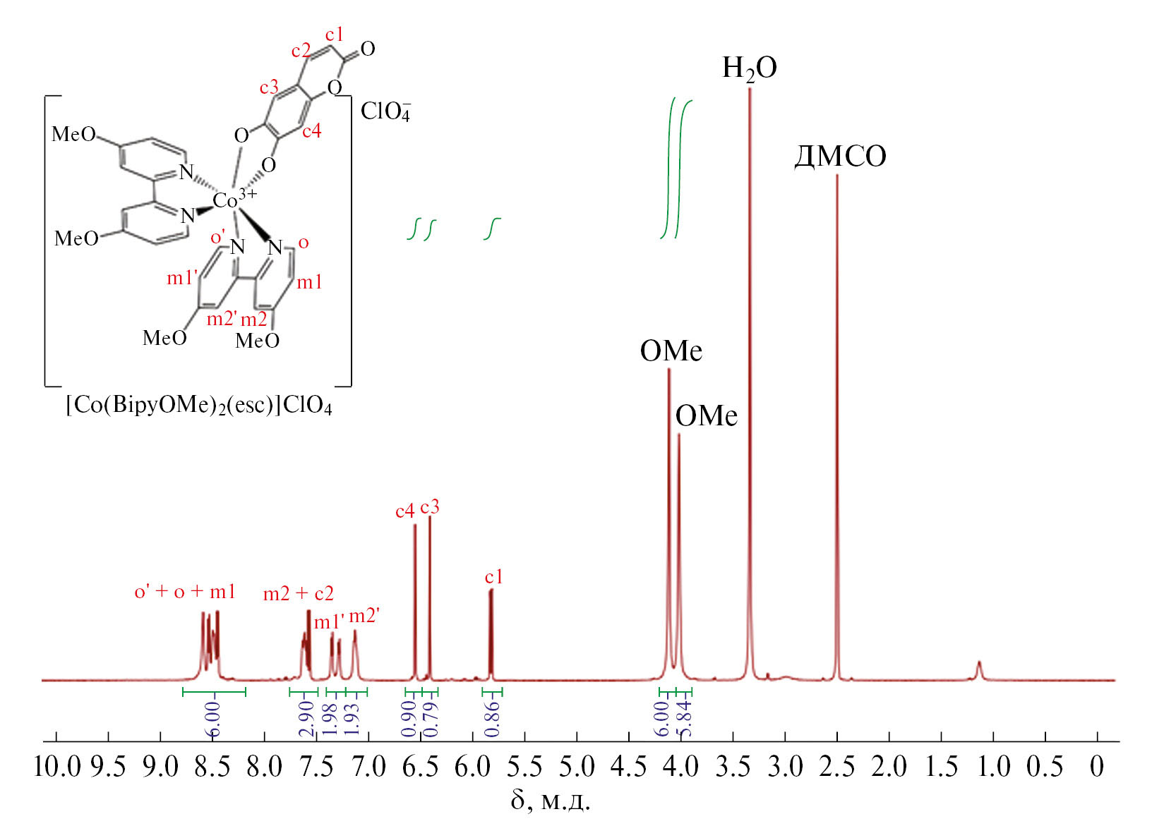 Синтез комплекса кобальта(III) [Co(BipyOMe)2(esc)]ClO4 (I) проводили в несколько стадий (см. cхему 1). На первой стадии 4,4′-диметоки-2,2′-бипиридин вводили в реакцию комплексообразования с гексагидратом хлорида кобальта(II) [12]. Полученный в результате этого комплекс кобальта(II) [Co(BipyOMe)2Cl2] окисляли газообразным хлором, генерируемым при взаимодействии перманганата калия с концентрированной соляной кислотой [13], с образованием комплекса кобальта(III) [Co(BipyOMe)2Cl2]Cl. Последующее взаимодействие [Co(BipyOMe)2Cl2]Cl с 6,7-дигидроксикумарином в присутствии триэтиламина и перхлората лития привело к образованию целевого комплекса [Co(BipyOMe)2(esc)]ClO4 (I), охарактеризованного с помощью масс-спектрометрии (рис. 1) и спектроскопии ЯМР на ядрах 1Н и 13С (рис. 2 и 3).