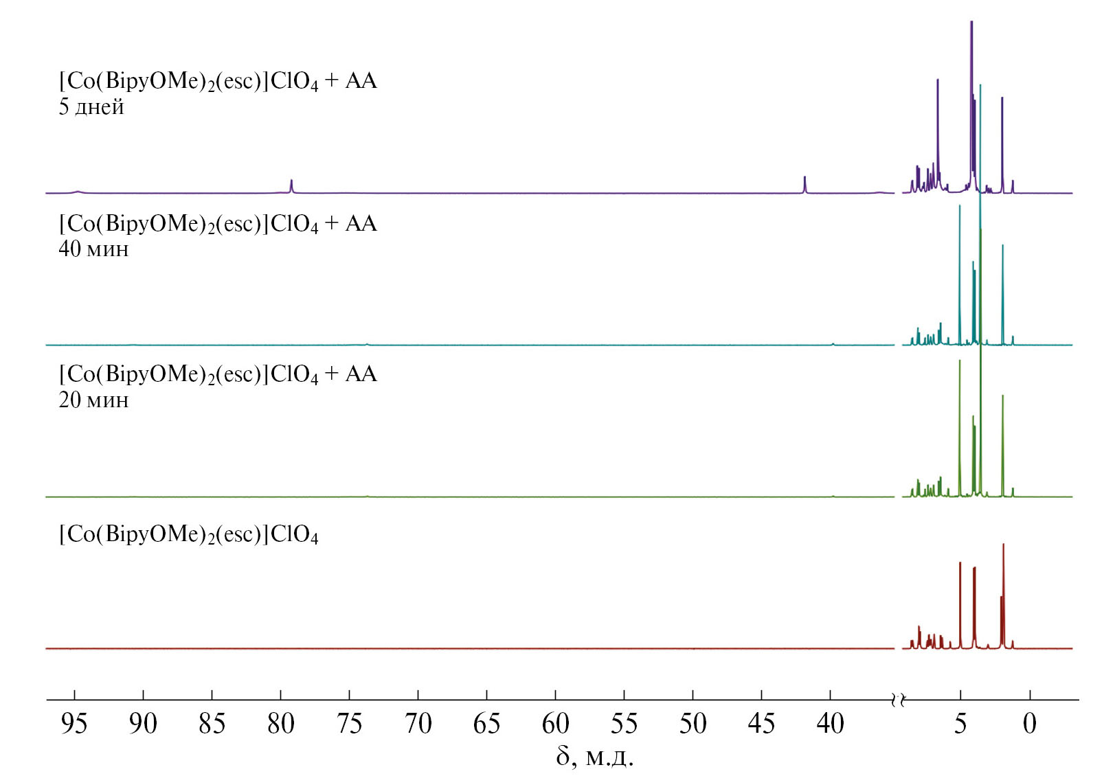 На рис. 4 приведены спектры ЯМР 1Н, иллюстрирующие динамику процесса восстановления комплекса I аскорбиновой кислотой. В спектрах можно выделить диамагнитную (от 0 до 10 м.д.) и парамагнитную (от 15 до 120 м.д.) области. Первая содержит сигналы исходного комплекса, аскорбиновой кислоты, продукта ее окисления и свободного 6,7-дигидроксикумарина, а вторая — сигналы образующихся комплексов кобальта(II). По мере протекания реакции интенсивность сигналов в диамагнитной области уменьшается, а в парамагнитной, наоборот, увеличивается. Видно, что реакция протекает достаточно медленно, так как интенсивные сигналы в парамагнитной области появляются только спустя 5 сут. Число сигналов в парамагнитной области, их химический сдвиг и интегральная интенсивность соответствуют комплексу [Co(BipyOMe)3]2+, что дополнительно подтверждается масс-спектрометрическим анализом продуктов восстановления. Масс-спектр реакционной смеси, изображенный на рис. 5, содержит интенсивные сигналы с m/z 353.8, 590.2 и 526.2, относящиеся к ионам [Co(BipyOMe)3]2+, [Co(BipyOMe)2(ClO4)]+ и [Co(BipyOMe)2Cl]+. Появление в масс-спектре аддуктов с хлорид-анионом может быть связано с неполной заменой хлорид-иона на перхлорат при синтезе I из [Co(BipyOMe)2Cl2]Cl. Также в масс-спектре реакционной смеси, зарегистрированном для положительных ионов, наблюдается сигнал с m/z 680.3, который предположительно можно отнести к комплексу кобальта(II) с окисленной формой аскорбиновой кислоты в качестве одного из лигандов (рис. 5). Таким образом, восстановление комплекса кобальта(III) [Co(BipyOMe)2(esc)]ClO4 протекает с образованием комплекса кобальта(II) [Co(BipyOMe)3](ClO4)2 и сопровождается высвобождением молекулы 6,7-дигидроксикумарина. Аналогичный механизм восстановления наблюдался для комплексов кобальта(III) с 6,7-дигидроксикумарином, содержащих бипиридин или фенантролин вместо 4,4ʹ-диметоки-2,2ʹ-бипиридинового лиганда.