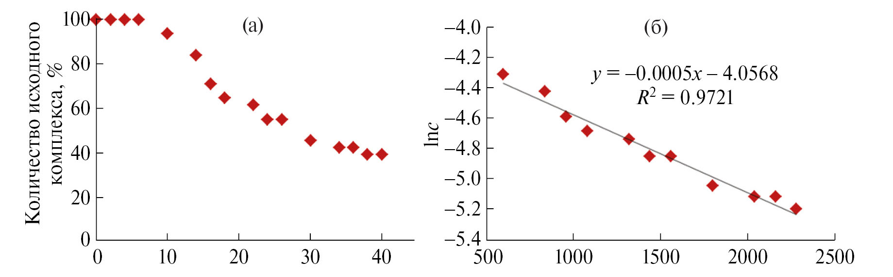 На рис. 6 представлена кинетическая кривая для комплекса I при восстановлении аскорбиновой кислотой в атмосфере аргона, полученная при анализе данных in situ спектроскопии ЯМР. Видно, что первые 10 мин соответствуют индукционному периоду реакции, когда концентрация исходного комплекса не изменялась. Далее наблюдалось медленное уменьшение количества исходного комплекса. Через 40 мин после добавления аскорбиновой кислоты конверсия составила ~60%. Зависимость натурального логарифма концентрации исходного комплекса от времени аппроксимируется прямой с коэффициентом достоверности, близким к единице (см. pис. 6). Линейная аппроксимация свидетельствует о первом порядке лимитирующей стадии процесса восстановления комплекса. Вероятнее всего, этой стадией является высвобождение молекулы 6,7-дигидроксикумарина. По тангенсу угла наклона прямой, изображенной на рис. 6, оценена константа скорости процесса восстановления комплекса I аскорбиновой кислотой в инертной атмосфере при 40°С, которая составила 5 × 10–4 с–1.