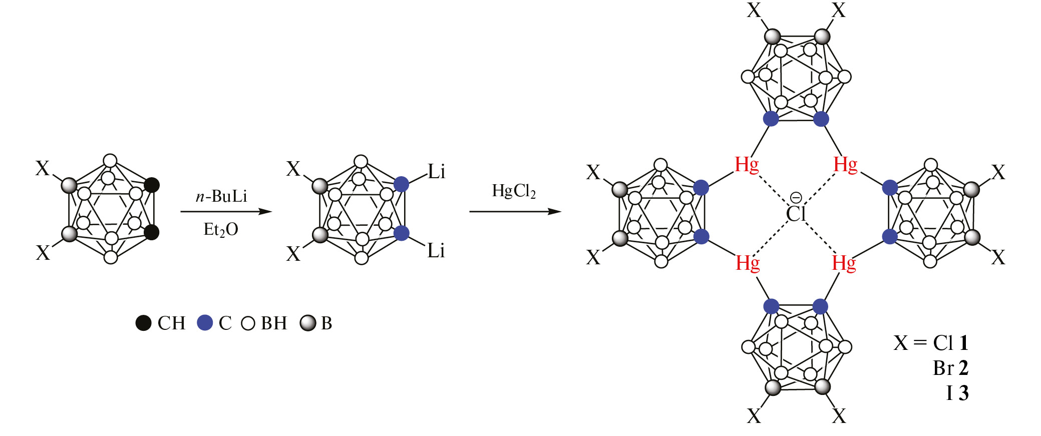 Галогенпроизводные [12]меркуракарборанда-4 [(9,12-X2-C2B10H8-1,2ʹ-Hg)4] (X = Cl, Br, I) получали аналогично незамещенному четырехртутному карборановому макроциклу темплатной сборкой при взаимодействии соответствующих дилитиевых производных 1,2-Li2-C2B10H8-9,12-X2 c хлоридом ртути(II) в диэтиловом эфире и выделяли в виде комплексов с хлорид ионом {[(9,12-X2-C2B10H8-1,2ʹ-Hg)4]Cl}– (X = Cl (1), Br (2), I (3)) (схема 1).