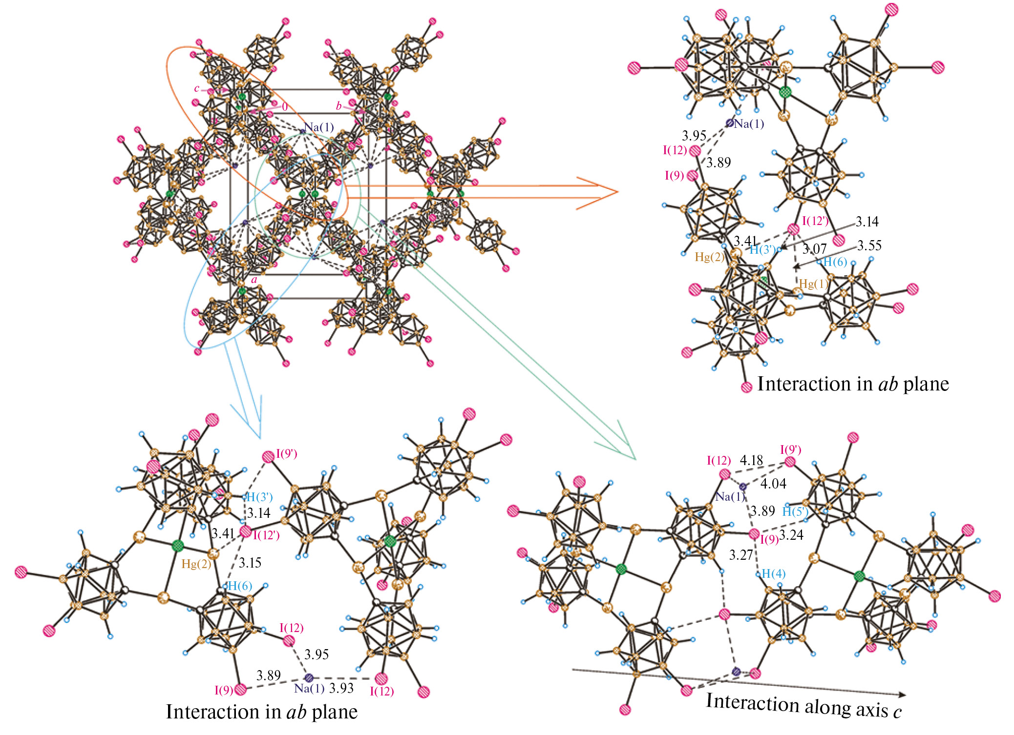 Кристаллическая структура комплекса III характеризуется наличием достаточно больших пустот, образующих каналы вдоль оси с. Объем пустоты на одну элементарную ячейку равен 1834 Å3 (25%). Каналы заполнены катионами Na+ и молекулами воды, большинство из которых сильно разупорядочено. При этом часть координационной сферы катиона Na+ занимают атомы иода. Схожая картина наблюдается в структуре {[(9,12-I2-C2B10H8-1,2ʹ-Hg)4]I2}Li2(Me2CO)6 · · 4H2O [31]. Помимо контактов Na···I, в кристалле имеют место весьма прочные межмолекулярные взаимодействия B–I···Hg; с расстояниями I···Hg (3.5462(2) и 3.4154(2) Å, рис. 2), соизмеримыми с расстояниями I···Hg в комплексах [12]меркуракарборандов-4 с иодид-анионом [16]. Отметим, что образование подобных межмолекулярных взаимодействий I···M характерно также и для других типов макроциклических полидентатных кислот Льюиса с галогенными заместителями на периферии гетеромакроцикла [37]. В кристаллической структуре III также имеются многочисленные водородные связи B–I···H–B (расстояние I···H в пределах 3.07–3.25 Å) и галогеновая связь I типа I(12)…I(9)ʹ (рис. 2).