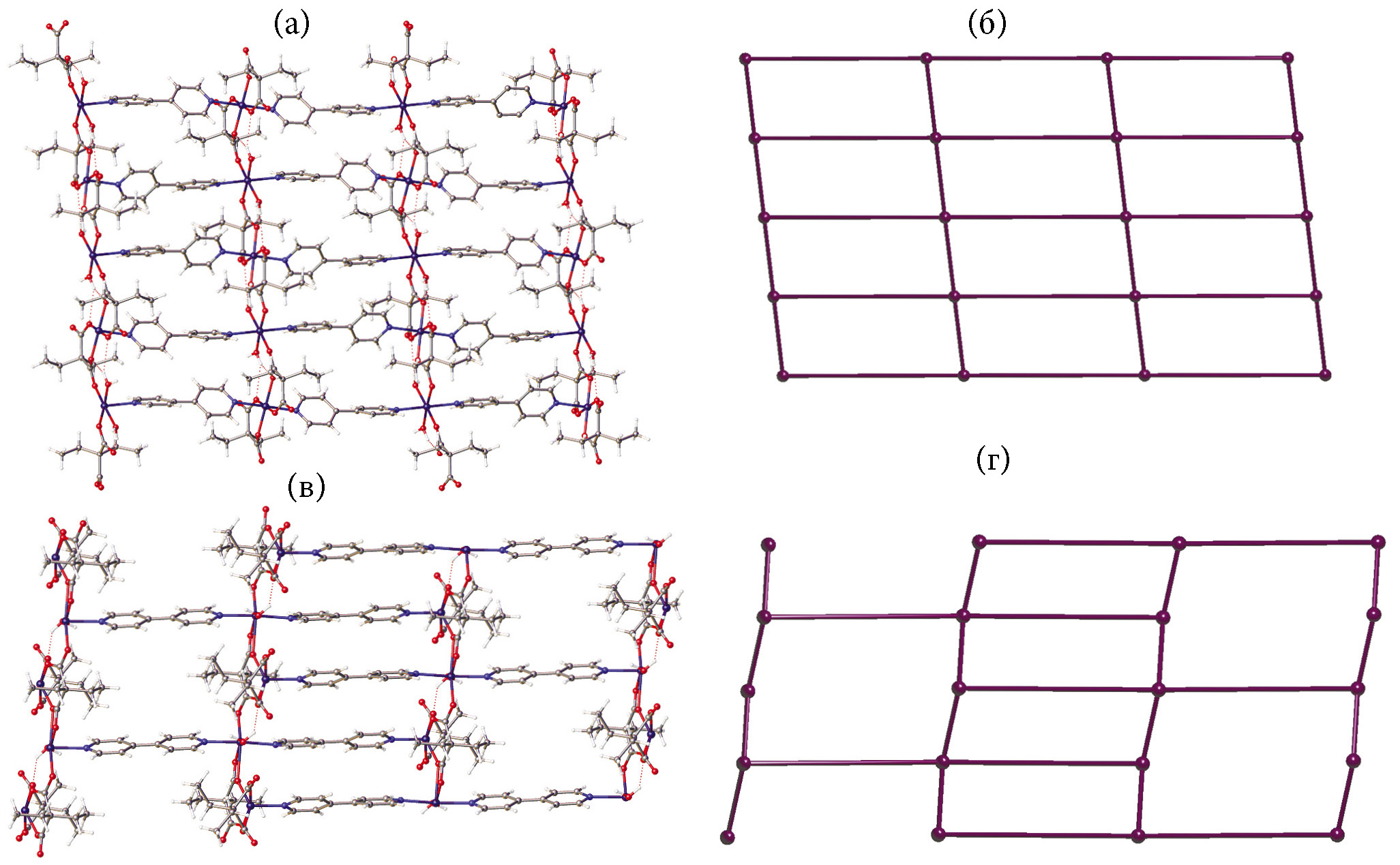 Рис. 2. Фрагменты слоев состава [Zn(H2O)(4,4´-bipy)(Et2mal)] и [Zn4(H2O)2(4,4´-bipy)3(Et2mal)4] в I (a) и II (в) и сеток, полученных упрощением этих структур с топологией sql (б) и bey (г) соответственно