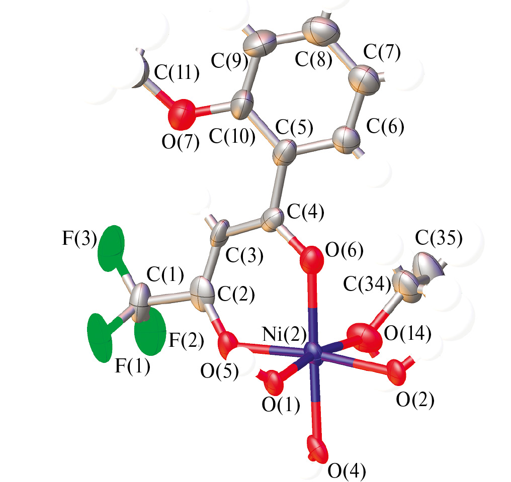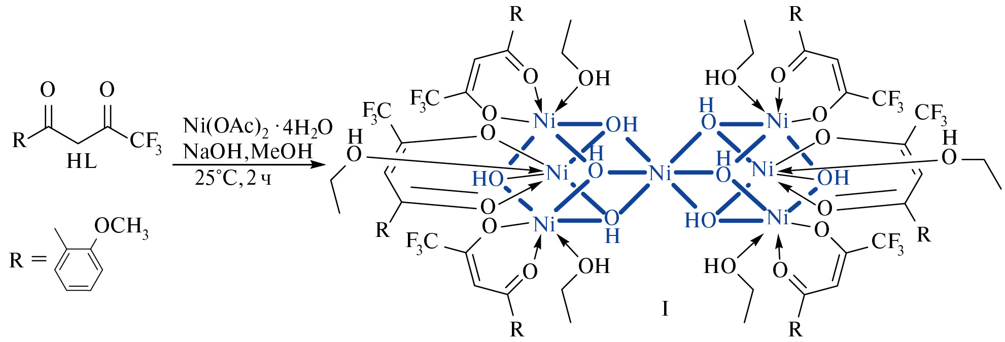 Синтез гексакис-(1,1,1-трифтор-4-(2-метоксифенил)бутан-2,4-дионато-O,O´)окта(µ3-гидрокси)гексакисэтанолгептаникеля(II) моногидрата [Ni7(L-κ2-O,O´)6(µ3-OH)8(EtOH)6] · H2O (I). К раствору HL и NaOH в метаноле добавляли раствор Ni(CH3СОO)2 · 4H2O в воде. Реакцию проводили при интенсивном перемешивании при комнатной температуре в течение 2 ч. Осадок отфильтровывали, промывали водой и сушили в вакууме. Образовавшийся продукт перекристаллизовывали из смеси Et2O–EtOH–Me2CO (8 : 1 : 1). Выход 25%.