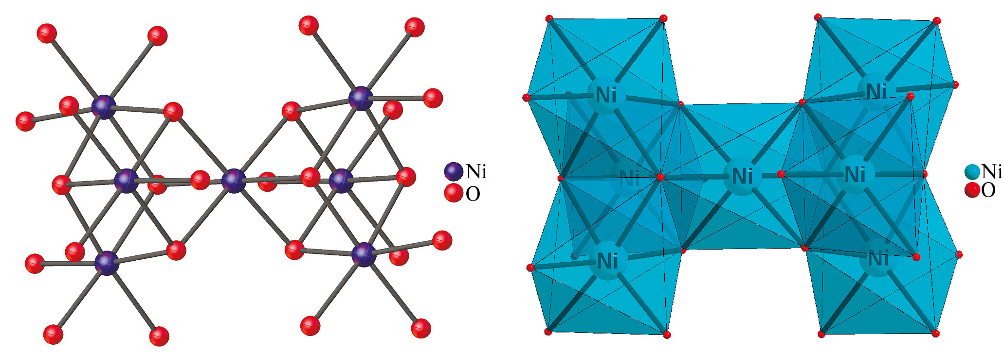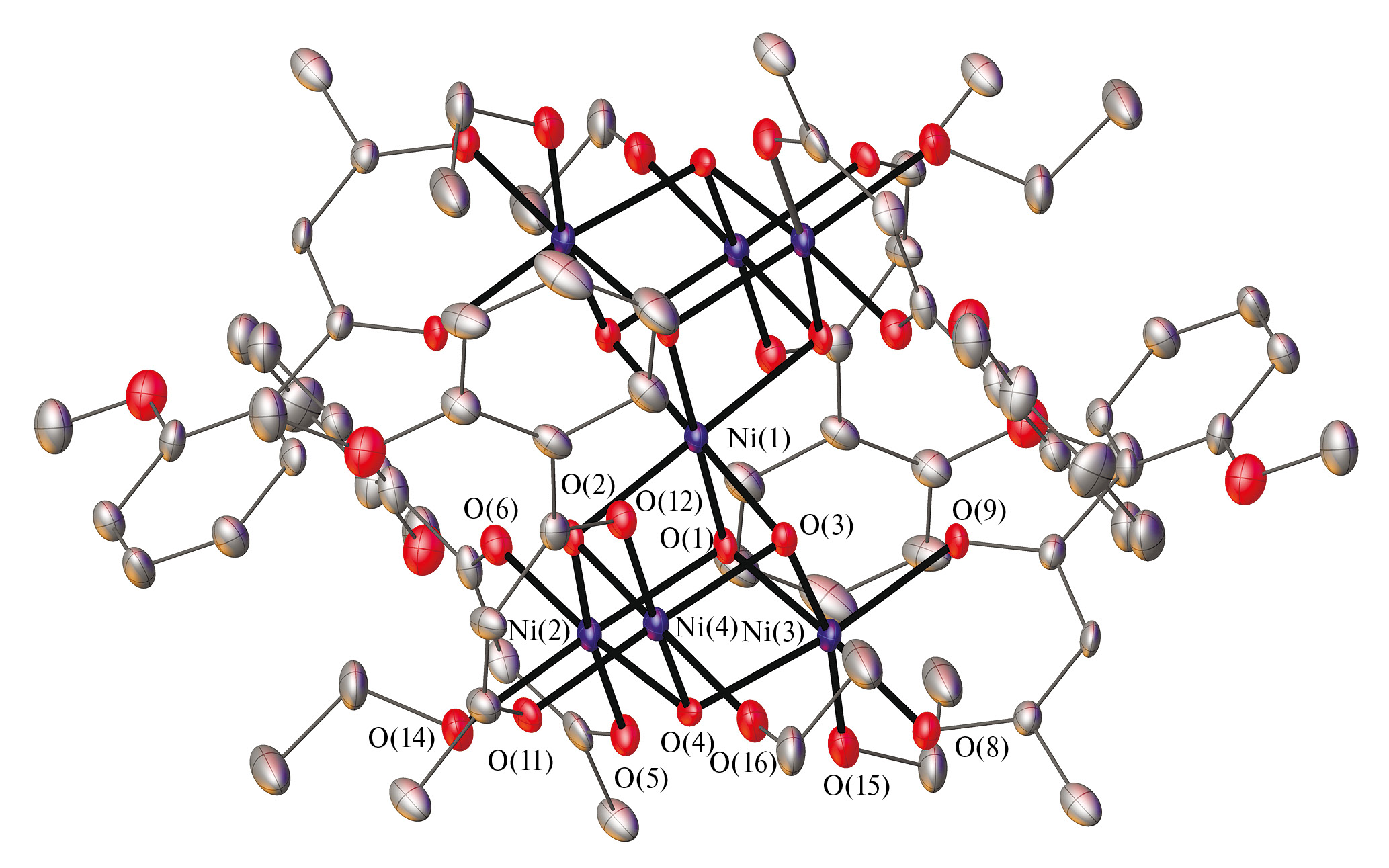 Гомометаллический гептаядерный комплекс никеля I имеет дикубановую структуру с общей вершиной (рис. 1). Атом Ni1 расположен в центре инверсии и связан с остальными кристаллографически независимыми металлоцентрами (Ni(2), Ni(3), Ni(4)) посредством трех кислородных атомов мостиковых µ3-OH-групп (O(1), O(2), O(3)). Четвертая µ3-OH-группа связывает три периферических металлоцентра через атом O(4). Таким образом, гексакоординированные атомы никеля вместе с атомами кислорода гидроксильных групп образуют кубановые фрагменты {Ni4O4} (рис. 2).
