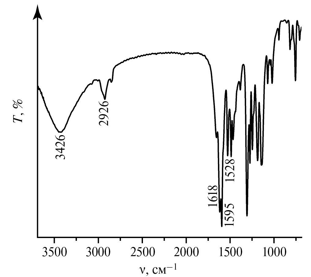 В ИК-спектре комплекса I (рис. 4) присутствуют характеристические ассимметрические валентные колебания группы связей C=C–C=O при 1618 см–1, которые также проявляются при 1595 см–1 вследствие координации лиганда HL на металлоцентр. Данные колебания в исходном лиганде проявляются в виде интенсивной широкой полосы с максимумом при 1604 см–1 [22]. Симметричные валентные колебания группы связей C=C–C=O при образовании комплекса I соответствуют полосе поглощения при 1528 см–1, в то время как в лиганде полоса поглощения данной группы наблюдается при 1490 см–1.