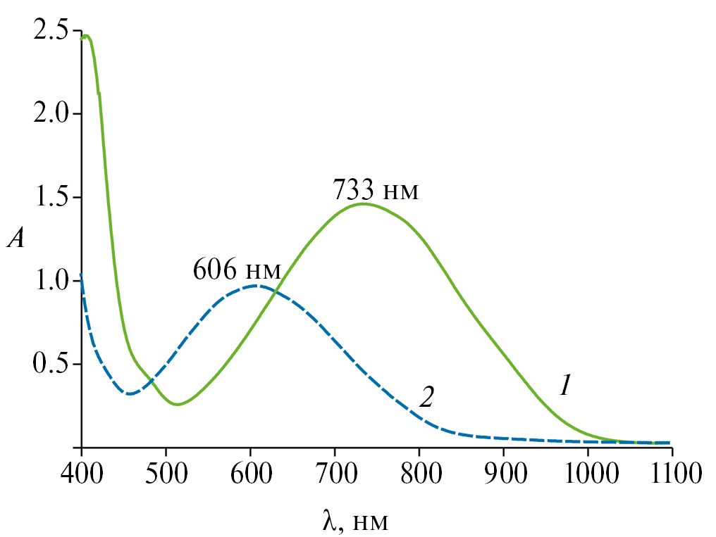 Соединение I не содержит координированного растворителя и поэтому имеет полимерную структуру. Напротив, в соединении II атом диспрозия координирует одну молекулу ДМЭ, что способствует образованию мономерного комплекса. Чтобы доказать образование мономерной структуры комплекса II присутствием молекул ДМЭ в координационной сфере диспрозия, была проведена реакция эквимольных количеств исходного соединения [(Dpp-bian)DyI(Dme)2] и Cp*K в координирующемся ДМЭ. В процессе реакции цвет раствора изменяется с синего на зеленый, а последующая кристаллизация из бензола приводит к образованию кристаллов комплекса II с выходом 48%. Его состав и строение подтверждены ИК-спектроскопией и методом РСА. Наличие полосы валентных колебаний одинарной связи C–N в ИК-спектрах комплексов I и II (1306 и 1300 см–1 соответственно) подтверждает дианионное состояние лиганда Dpp-bian. Универсальным инструментом для определения состояния восстановления Dpp-bian в комплексах металлов в растворе является УФ-спектроскопия, поскольку значения максимумов поглощения (Dpp-bian)0, (Dpp-bian)− и (Dpp-bian)2– существенно различаются [42]. Из-за своей полимерной природы соединение I плохо растворимо в бензоле: при растворении образуется слегка окрашенный в зеленый цвет раствор с максимумами пропускания и поглощения при 513 и 733 нм соответственно (рис. 1). Спектр соединения II в бензоле имеет максимум поглощения при 606 нм (синий цвет, максимум пропускания 465 нм) (рис. 1), что характерно для комплексов лантаноидов(III) с дианионным аценафтен-1,2-дииминовым лигандом Dpp-bian. Так, максимум поглощения раствора комплекса [(Dpp-bian)Sm(m-Br)(Dme)]2 в ТГФ составляет 640 нм [20], а соединения иттербия [(Dpp-bian)Yb[SC(S)NMe2](Dme)] в ДМЭ — 691 нм [43]. Из-за высокой чувствительности соединений I и II к кислороду и влаге коэффициенты экстинкции не могли быть достоверно определены.