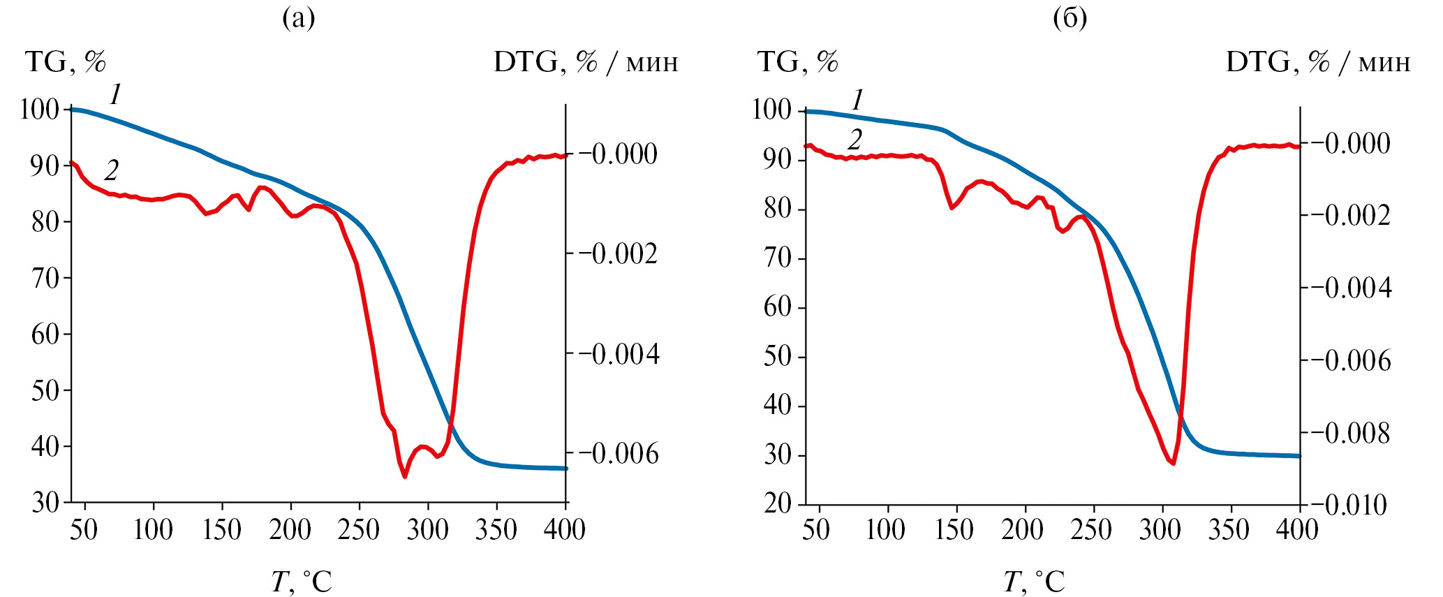 Рис. 2. Термогравиметрический анализ комплексов I (а) и II (б): ТГ (1), ДТГ (2).