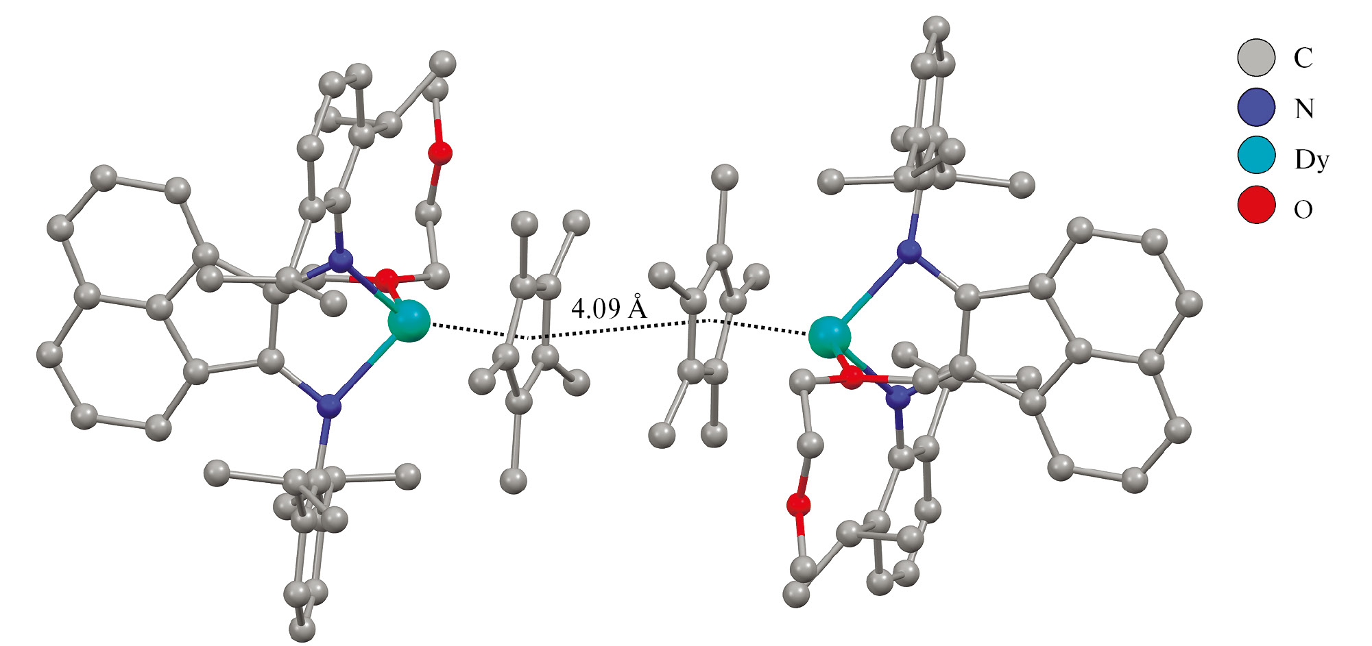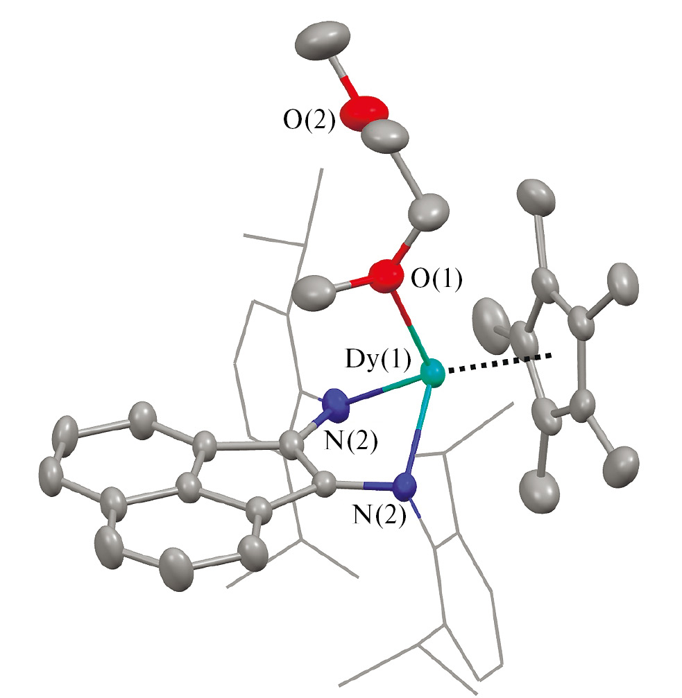 В отличие от полимера I, комплекс II имеет мономерную структуру (рис. 5). Благодаря заполнению координационной сферы атома диспрозия молекулой ДМЭ, молекула II не содержит иодида калия. При этом атом диспрозия координирует дииминовый и пентаметилциклопентадиенильный лиганды, а также молекулу ДМЭ, которая связана монодентатно. На две молекулы комплекса в кристалле приходится три молекулы бензола. Длины связей дииминового фрагмента N(1)–C(1), N(2)–C(2) и C(1)–C(2) (1.391(4), 1.396(5) и 1.404(5) Å соответственно) находятся в хорошем согласии со значениями для тех же связей в продукте I, что подтверждает дианионное состояние лиганда в обоих случаях. Расстояния Dy–N (2.207(3) и 2.214(3) Å) в комплексе II аналогичны расстояниям Dy–N в полимере I. Пятичленный металлоцикл в комплексе II не плоский, значение двугранного угла между плоскостями NCCN и NDyN составляет 138.4°, что близко к значению соответствующего угла в продукте I (138.2°). Расстояние Dy–Cpcentr равно 2.358 Å (для сравнения: в полимере I это расстояние составляет 2.375 Å).