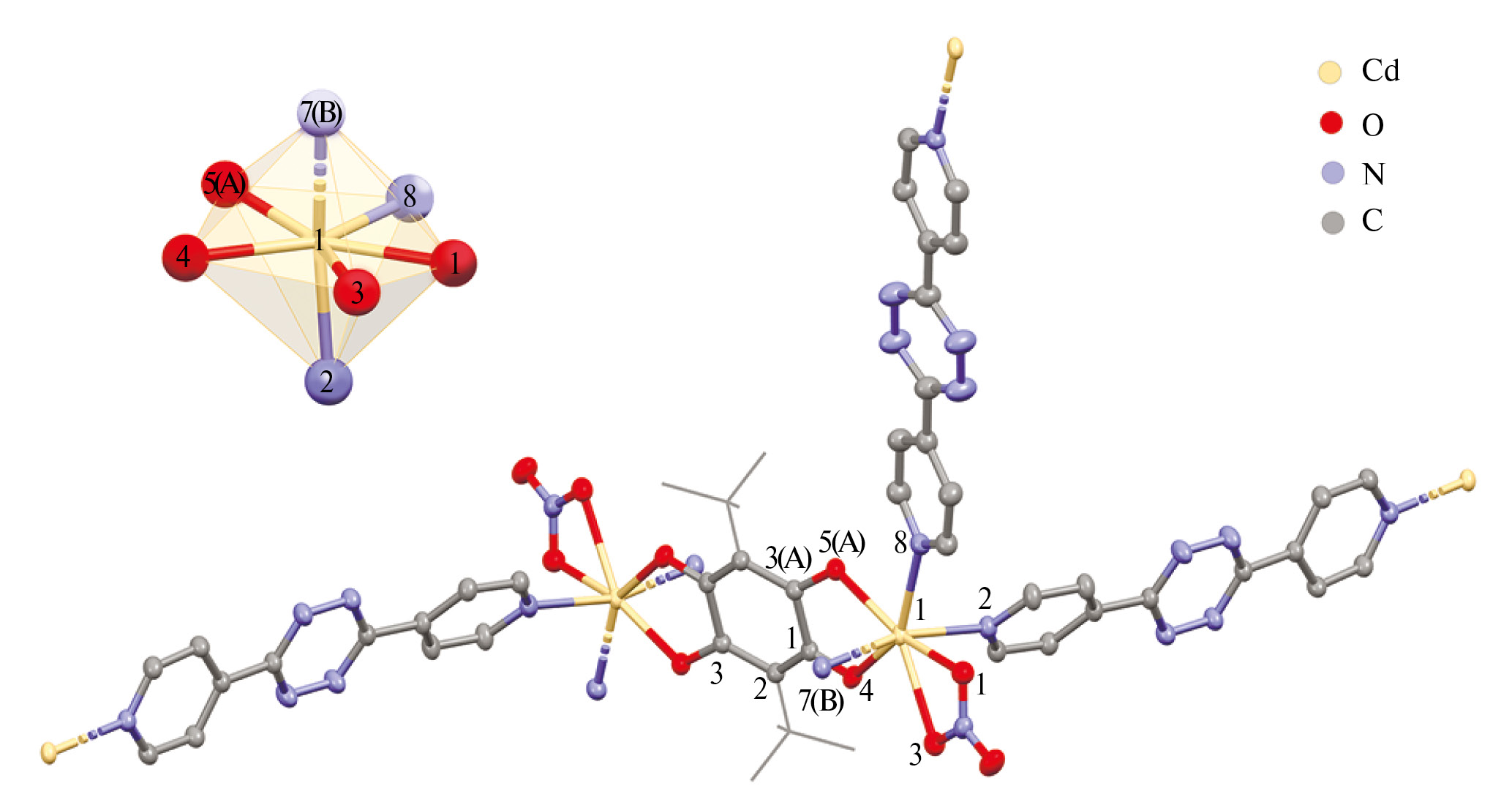 Цинк в [Zn(pQ)(DPT)] · 2DMF имеет шестикоординационное октаэдрическое окружение, образованное четырьмя атомами кислорода двух анилатных лигандов и двумя атомами азота двух тетразиновых линкеров (рис. 1). Кадмий в [Cd2(NO3)2(pQ)(DPT)3] · 2DMF · 2MeOH имеет координационное число, равное семи (рис. 2). Элементарное звено формируется путем связывания двух катионов кадмия депротонированным мостиковым дигидрокси-пара-хиноновым лигандом. При этом на атомах металла сохраняется по одной нитратной группе, а дополняют координационную сферу металла три мостиковых бис(пиридил)тетразина. Координация дополнительного нейтрального линкера на ион кадмия хорошо согласуется с увеличением ковалентного радиуса металла в сравнении с цинком (r(Cd) = 1.44 Å, r(Zn) = 1.22 Å [68]). Координационное окружение кадмия представляет собой искаженную пентагональную бипирамиду, экваториальную плоскость которой формируют кислородные атомы одного анилатного лиганда, два кислорода бидентатно связанного нитрат-аниона и один атом азота тетразинового лиганда. В вершинах пирамиды расположены атомы азота двух других тетразиновых линкеров.