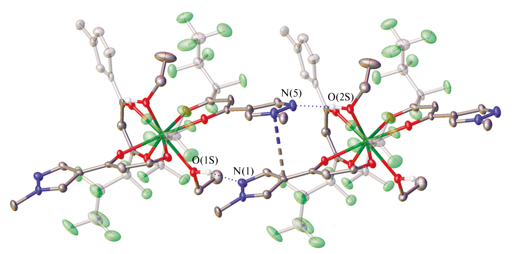 Рис. 2. Система водородных и π…π-взаимодействий, стабилизирующих кристаллическую упаковку соединения I. Водородные связи изображены точечными линиями, кратчайшее расстояние между π-системами — штриховой линией. Представлены только атомы водорода гидроксильных групп молекул этанола, а перфторированные заместители ß-дикетонатного лиганда изображены полупрозрачными.