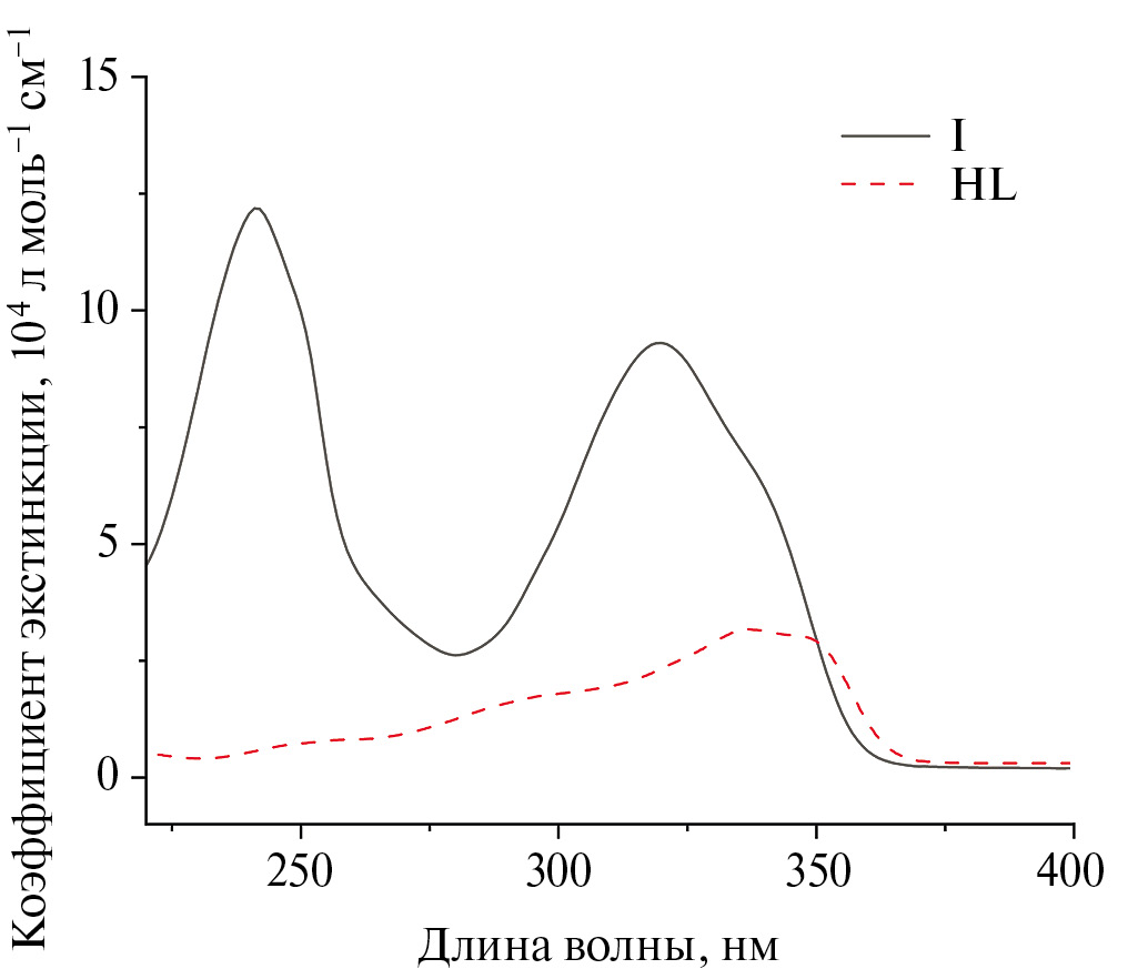 Спектры поглощения растворов комплекса I и свободного лиганда HL в ацетонитриле представлены на рис. 3. Комплекс I проявляет выраженное поглощение в ультрафиолетовой области спектра от 220 до 380 нм, связанное с электронными p–p*-переходами внутри 1,3-дикетонного фрагмента. Коэффициент молярной экстинкции составляет порядка 90 000 л моль–¹ см–¹ в спектральной полосе с максимумом на длине волны 325 нм для комплекса I. В его спектре не наблюдаются полосы собственного поглощения центрального иона Tb3+, поскольку молярная экстинкция (e ≈ 10 л моль–¹ см–¹) для иона значительно меньше, чем для органического лиганда HL.