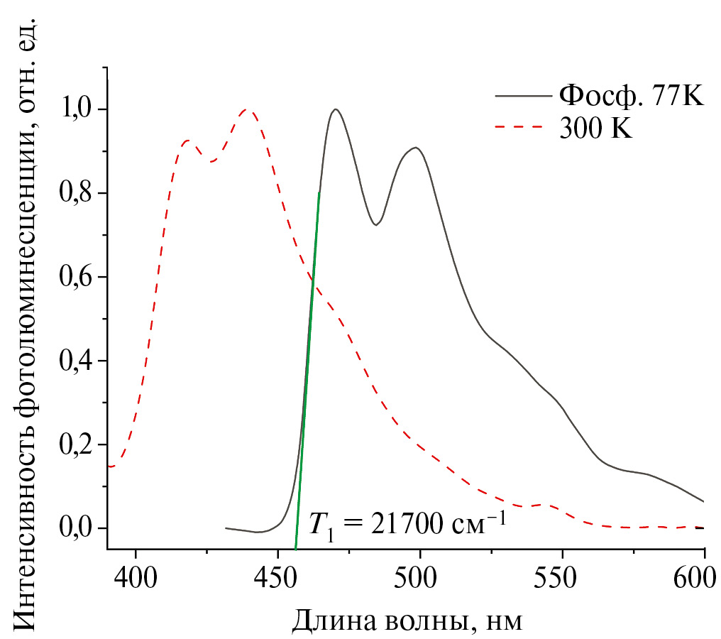 Энергия нижнего триплетного уровня T1 лиганда L была оценена с помощью метода касательных по краю высокоэнергетической полосы в спектре фосфоресценции для комплекса II, зарегистрированном при температуре 77 K (рис. 7). Энергия триплетного уровня T1, определенная с помощью данной методики, составляет 21 700 см–¹.