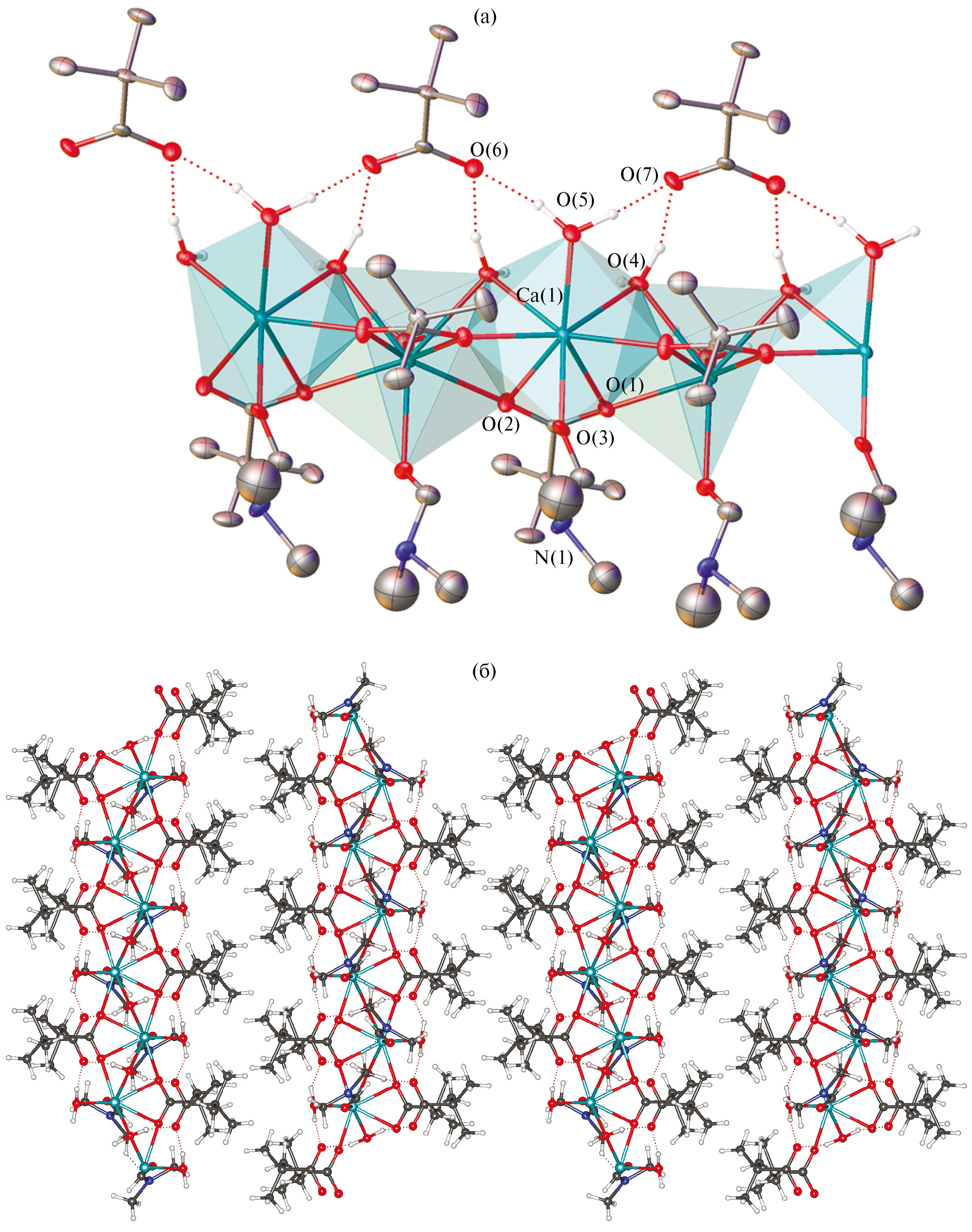 Соединение II также кристаллизуется в моноклинной пространственной группе P21/c и представляет собой 1D-полимерную структуру (рис. 2), однако, ее строение совершенно отлично от I. В II на один атом Ca приходится два Piv-аниона, один из которых располагается во внешней сфере, две молекулы воды, кроме того, одно из положений занимают молекула ДМФА или молекула воды. При этом молекула ДМФА разупорядочена по двум положениям, в результате соотношение частей составляет 0.33 : 0.33 : 0.33. В третьей части, помимо координированной воды, появляется также еще одна молекула воды во внешней сфере, заселенность которой, соответственно, составляет также 0.33. Восьмикоординированные полиэдры кальция представляют собой квадратные антипризмы (1.407 и 1.990 для первой и второй частей разупорядоченной молекулы ДМФА и 1.567 для молекулы воды), образованные одним хелатно координированным и двумя мостиковыми пивалат-анионами, тремя молекулами воды и атомом кислорода неупорядоченных молекул воды и ДМФА. Расстояния Ca–O находятся в пределах 2.357(4)–2.538(4) Å. Атомы кальция находятся на расстоянии 3.6013(10) Å и образуют плоскость. По две противоположные стороны от нее располагаются Piv-анионы, плоскости хелатных циклов CaO2C при этом располагаются под углом примерно 15˚ относительно плоскости, образованной атомами металла. Неупорядоченные молекулы ДМФА/H2O находятся между плоскостями, образованными карбоксилатными группами, и смотрят вверх относительно плоскости металлов; таким образом, в указанных трех направлениях поверхность полимера состоит из гидрофобных фрагментов. В свою очередь, снизу от плоскости, образованной металлами, расположены молекулы воды, образуя гидрофильный слой, с которым сильными водородными контактами OH···O связываются внешнесферные Piv-анионы (табл. 2). За счет этой гидрофильной прослойки полимерные цепи связываются в слои, образующие кристаллическую упаковку соединения.