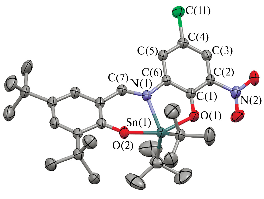 Синтез комплексов олова (L)SnR2 (I–VI) выполняли обменной реакцией между R2SnCl2 (0.3 ммоль) и 1 экв. основания Шиффа (L1H2–L4H2) в ацетонитриле в присутствии 2 экв. триэтиламина по ранее описанной методике [30].