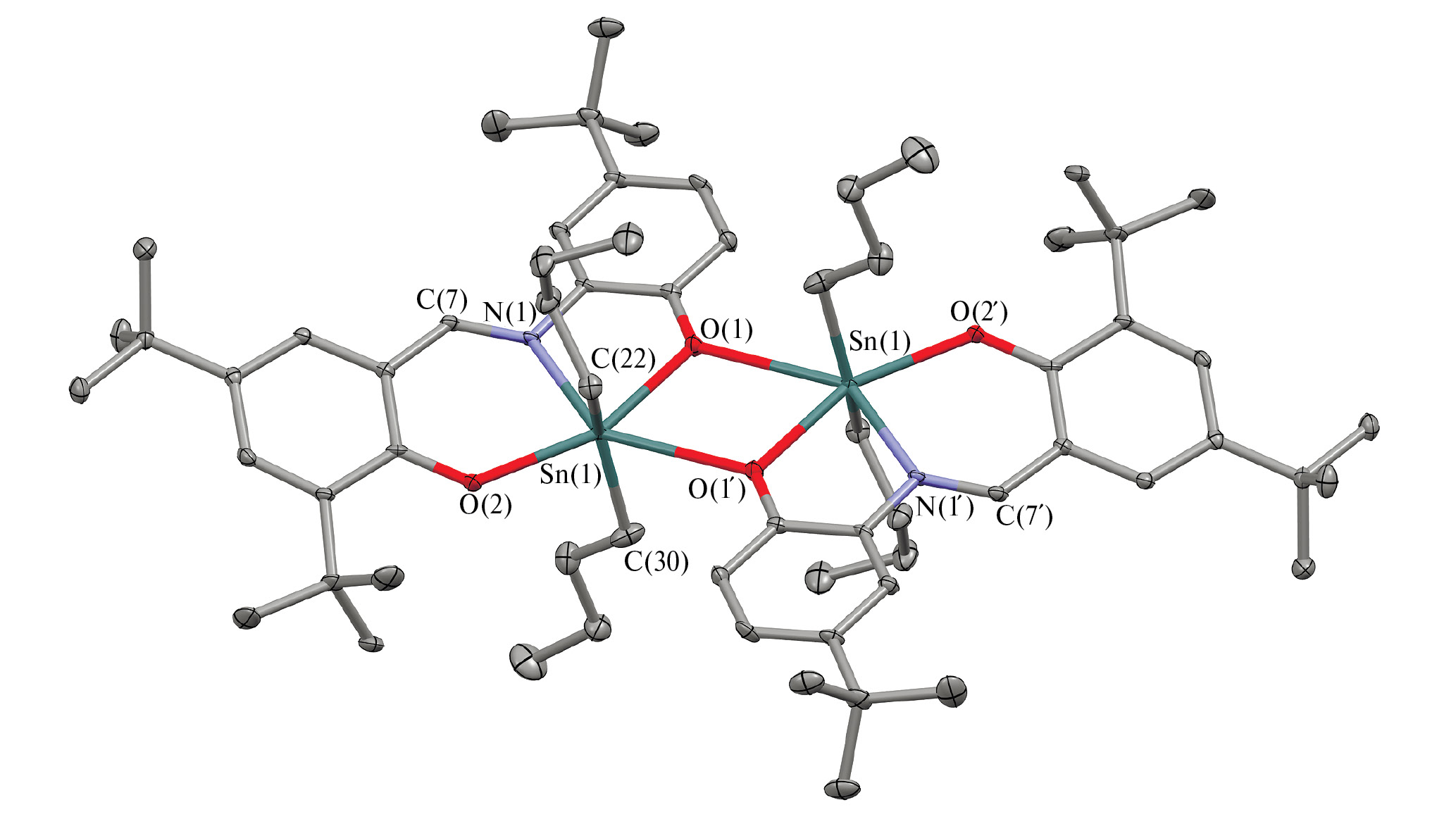 Комплекс L2SntBu2 (IV) является моноядерным производным пятикоординационного олова(IV) с O,N,O΄-тридентатным редокс-активным лигандом, и в целом строение данного комплекса в кристалле близко к строению ранее изученных комплексов олова(IV) вида (ONO)SnR2, (ONS)SnR2 [19, 47–53]. В противоположность этому комплекс L1SnnBu2 (I), который, согласно данным спектроскопии ЯМР в растворе, также является моноядерным, в кристаллическом виде представляет собой димер [L1SnnBu2]2 (рис. 2). Подобное строение было показано для родственных комплексов олова, например Et2Sn(t-Bu2ONO–Cl2–Me) [30], nBu2Sn(Cl2ONO–NO2) [50].