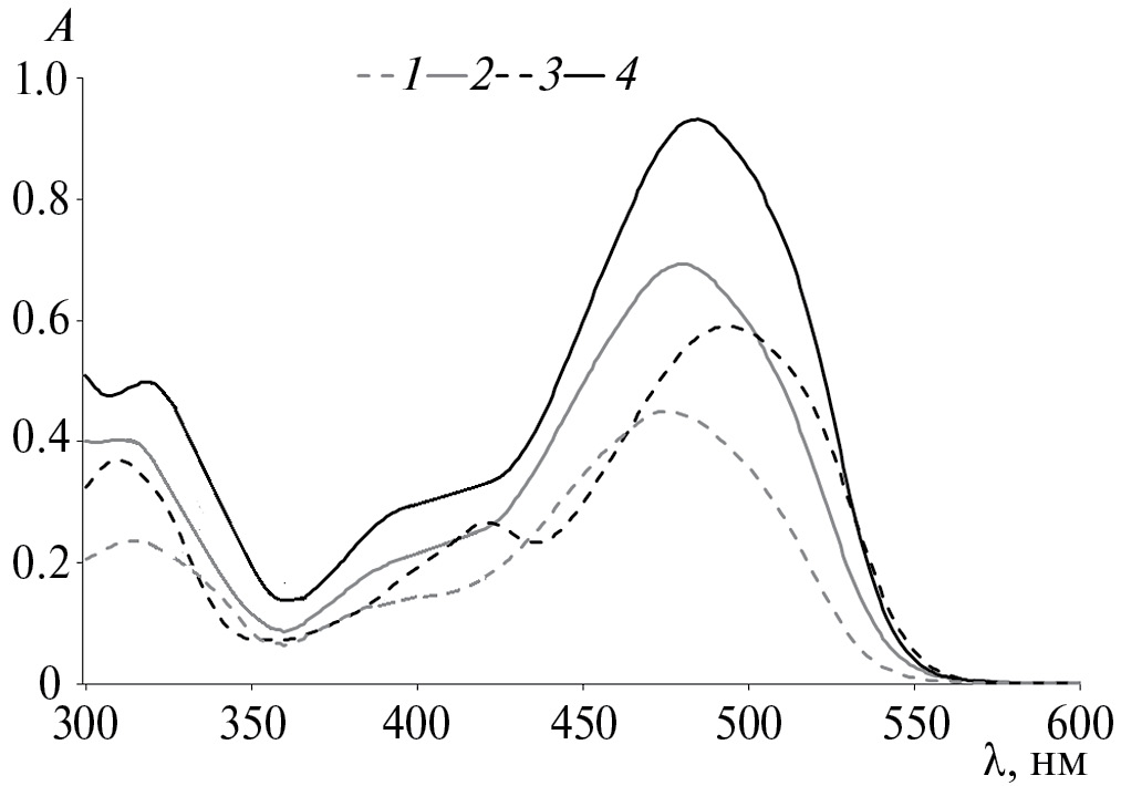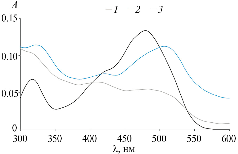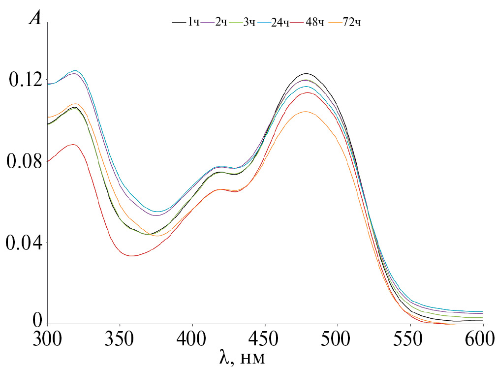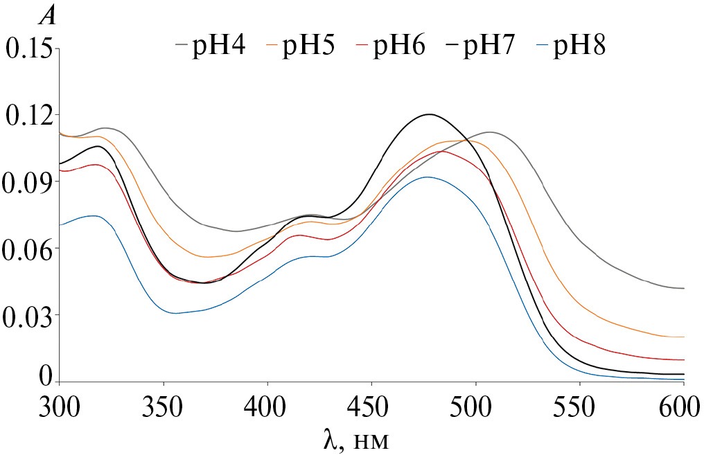 Для исследования устойчивости комплексов (II, IV, IX, X) в водных растворах при различных значениях рН растворяли исходные соединения в ДМСО (0.001 моль/л). Аликвоту стартового раствора диметилсульфоксида (ДМСО) вносили в водный раствор с величиной рН, варьирующейся от 4 до 9, или использовали фосфатный буфер с рН 7.4. Конечная концентрация комплексов в растворе составляла 5 µмоль/л. Для поддержания определенного значения рН среды использовали 1 М растворы HCl или KOH. Измерения проводили в трех повторностях.